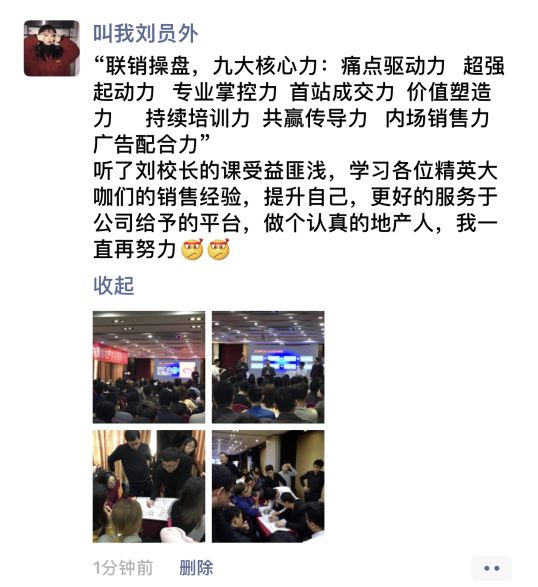 刘老师先后服务于万科、绿地、碧桂园、融创、世茂、中海、富力、金地等5000余家企业20万余名学员。2013年起每年授课200天以上,连续6年在房地产讲师中排名第一。被称为讲师中的“铁人”,刘老师不在讲课,就在去讲课的路上。