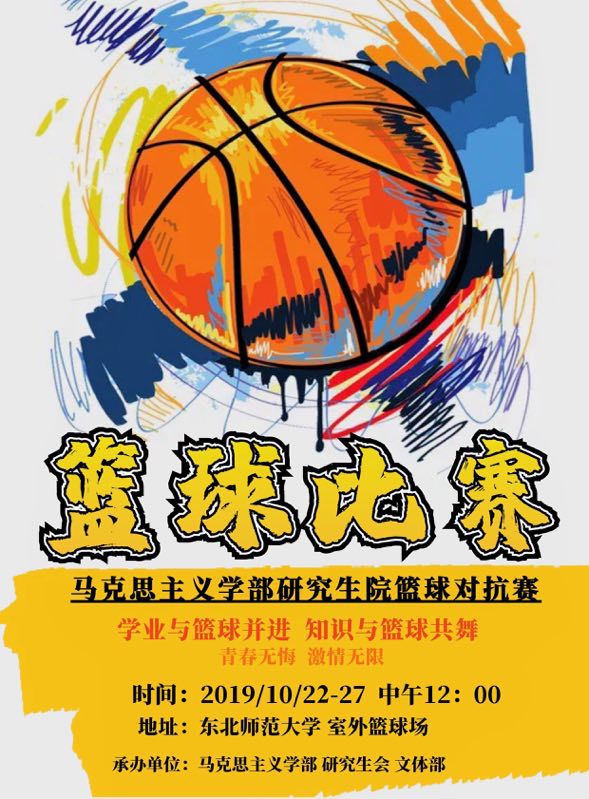 为了提高我部研究生综合素质、加强协作能力,营造一个积极、健康、朝气蓬勃的校园运动氛围,同时培养同学们的竞争意识和拼搏精神。在马克思主义学部的文体部组织,其他兄弟部门的配合下。定于2019年10月22日至27日(具体比赛时间根据天气决定、另行通知)举办新生篮球赛。