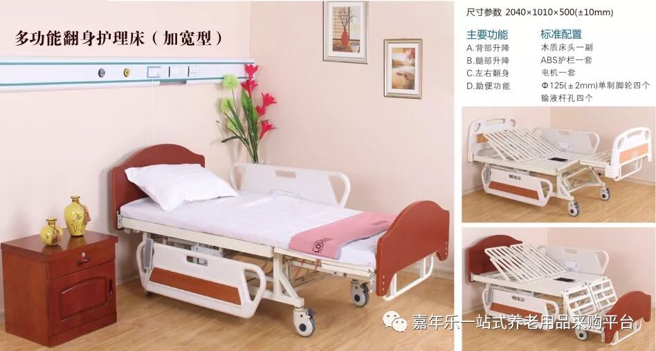 产品配置:居家风格护理床、适老椅、适老桌、床头柜、衣柜、床上用品、靠垫、防褥疮床垫、防褥疮小物件等