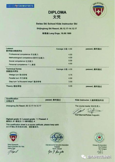 (2)教练团队取得了15个瑞士国际滑雪指导员一级证书,具备了在39个国家和地区从事滑雪教学的资格,PSIA美国一级滑雪指导证书2个,获得北京红十字会救护员证。