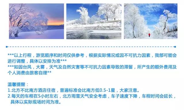 东北特殊性,有些项目体验,会因天气情况无法安排的情况(如冰雪厚度不够的情况)。以景区实际规定安排为准。