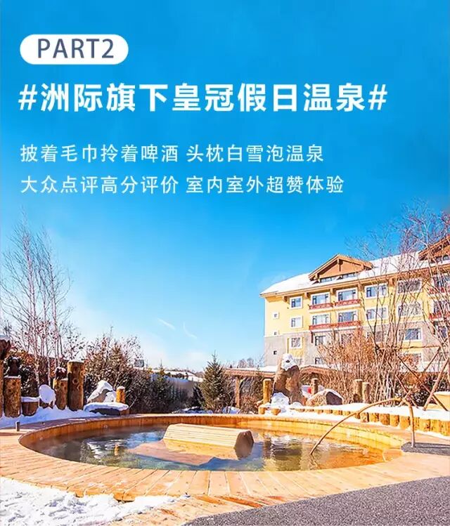 3、赠送两次长白山温泉体验(含一次皇冠假日温泉泡温泉,1.2米以下儿童,占床赠送,不占床不赠送)。