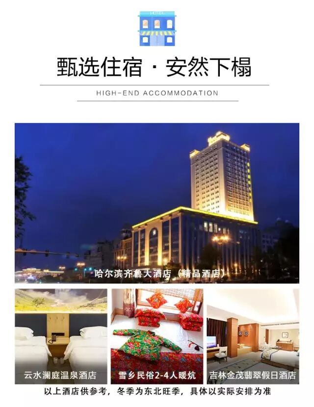 4、住宿哈尔滨精品型住宿,中国雪岭私家客栈+长白山温泉度假酒店(大众点评top1皇冠假日室外温泉泡温泉),吉林精品型住宿酒店,传统雪乡包炕;