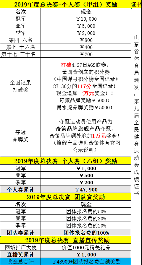 2、前十六名运动员均能获得由山东省体育局认证的第九届全民健身运动会名次证书(获奖证书带有山东省体育局公章)。