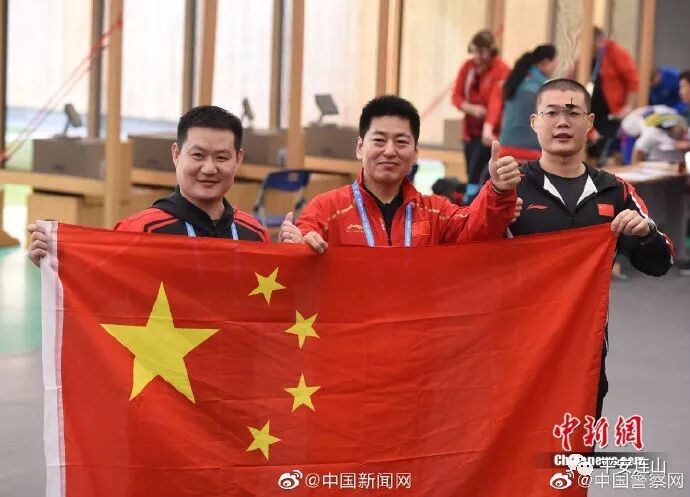#第七届世界军运会#19日举行射击男子25米手枪军事速射团体赛,中国八一射击队蝉联该项目冠军,这也是中国代表团在本届赛事中收获的第一枚金牌。赛后,中国队选手谢振翔、金泳德和姚兆楠(左起)举起国旗庆祝夺金。#中国代表团军运会首金#