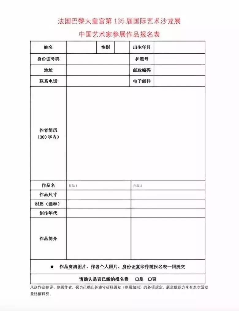 报名费收讫后作品正式列入参评。报名费用作媒体宣传、国内展览、作品集出版、海内外评委费用等,报名注册后一律不退(入展巴黎大皇宫展览的作者,个人承担签证、保险、国际往返旅费和食宿交通等参展费用)。