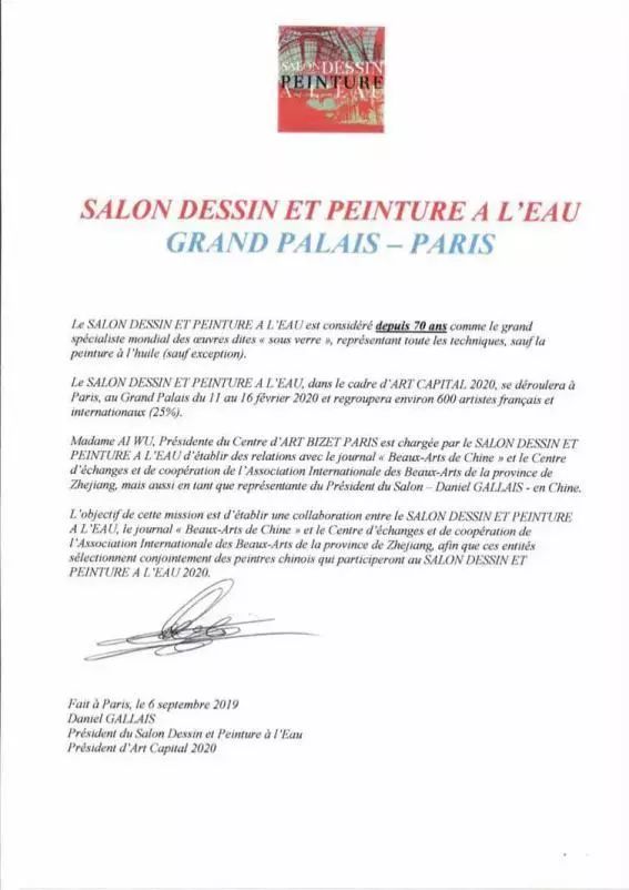 本届大皇宫暨水介质绘画沙龙主席丹尼尔·嘉莱先生签名授权书