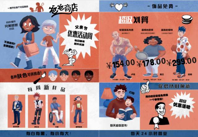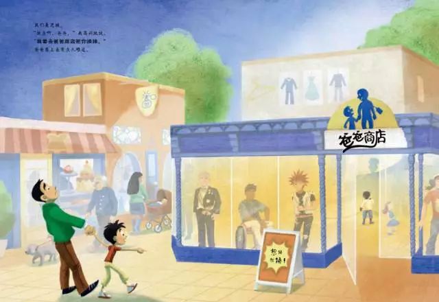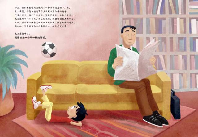 今天,我们家的信箱里收到了一份爸爸商店的小广告,它上面说,你能在爸爸商店里找到各种各样的爸爸。我已经有了一个爸爸,但我真的不喜欢他。爸爸和我在外面踢球时,五分钟后他就累了。我从游泳池最高的跳台上跳水时,他甚至都没看见。在游乐园里,他认为什么都太贵。我真是受够了,我要去换一个不一样的爸爸。