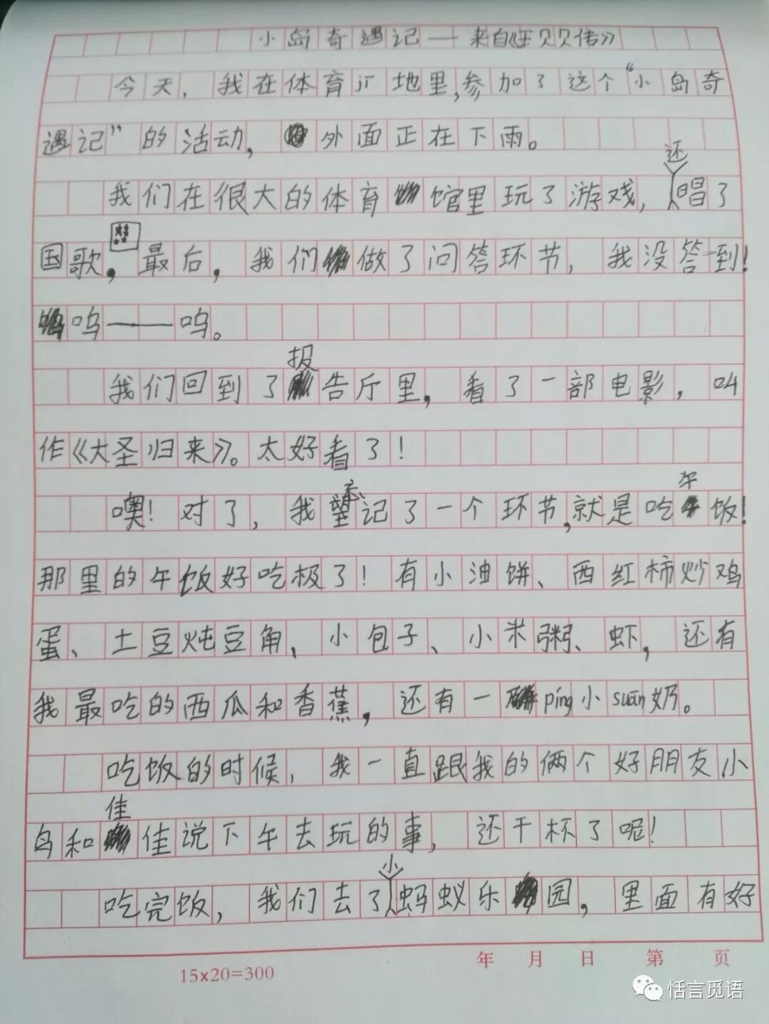 今天,我在体育基地参加了“小岛奇遇记”的活动,外面正在下雨。