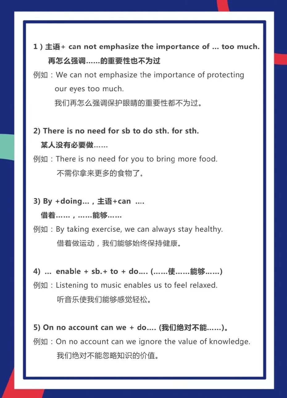 背例句还有一个好处就是,顺便把单词给背了,提升单词量也能提升语感。小编已经整理成图片的模式了,同学们可以保存下来,内容不多,零碎时间完全可以搞定,一天还能回复多次,直到真正记下来。