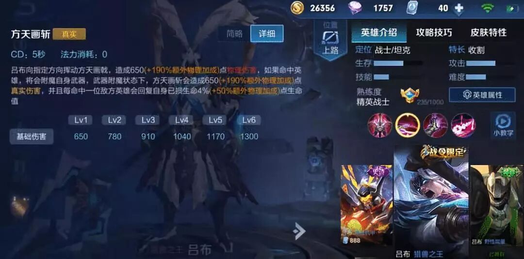 王者峡谷中吕布给人的印象就是“真实伤害”、“大团控”、“护盾”,其中超高的真实伤害堪称坦克英雄的噩梦。吕布的核心附魔能力来源于他的一技能,一技能方天画斩如果命中敌方英雄,将会附魔自身武器,武器在附魔状态下可以打出超噶的真实伤害,并且回复自身生命值,当然吕布的被动技能也建立在武器附魔状态下,所以吕布一技能命中敌方英雄就成为了重中之重。