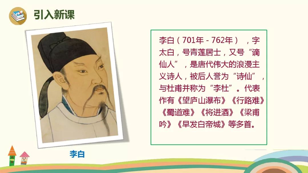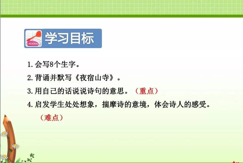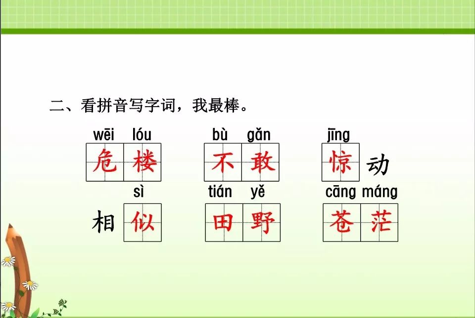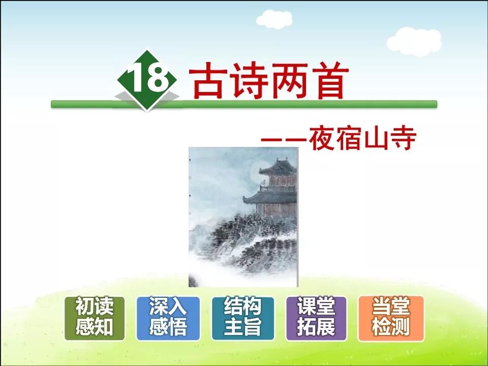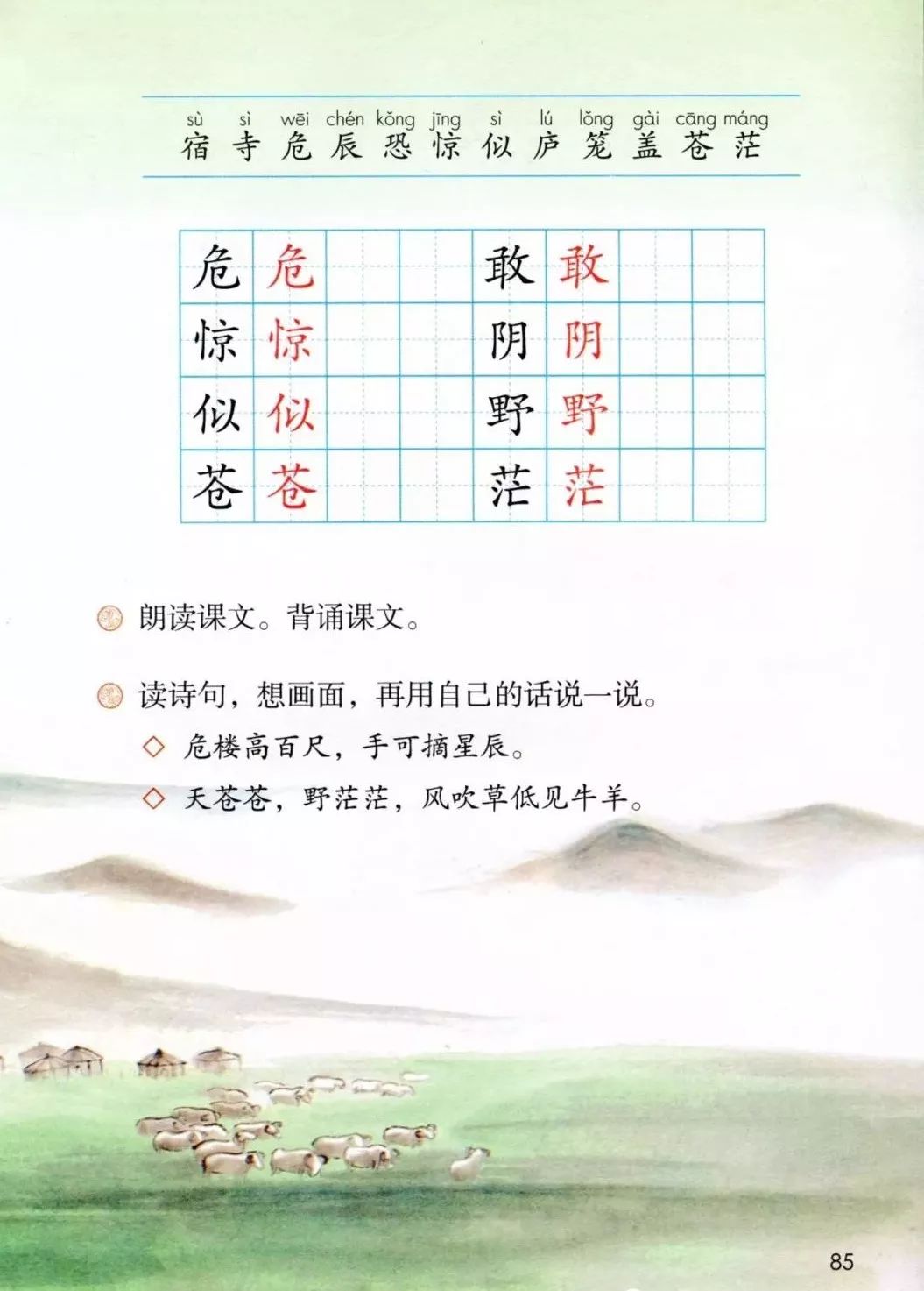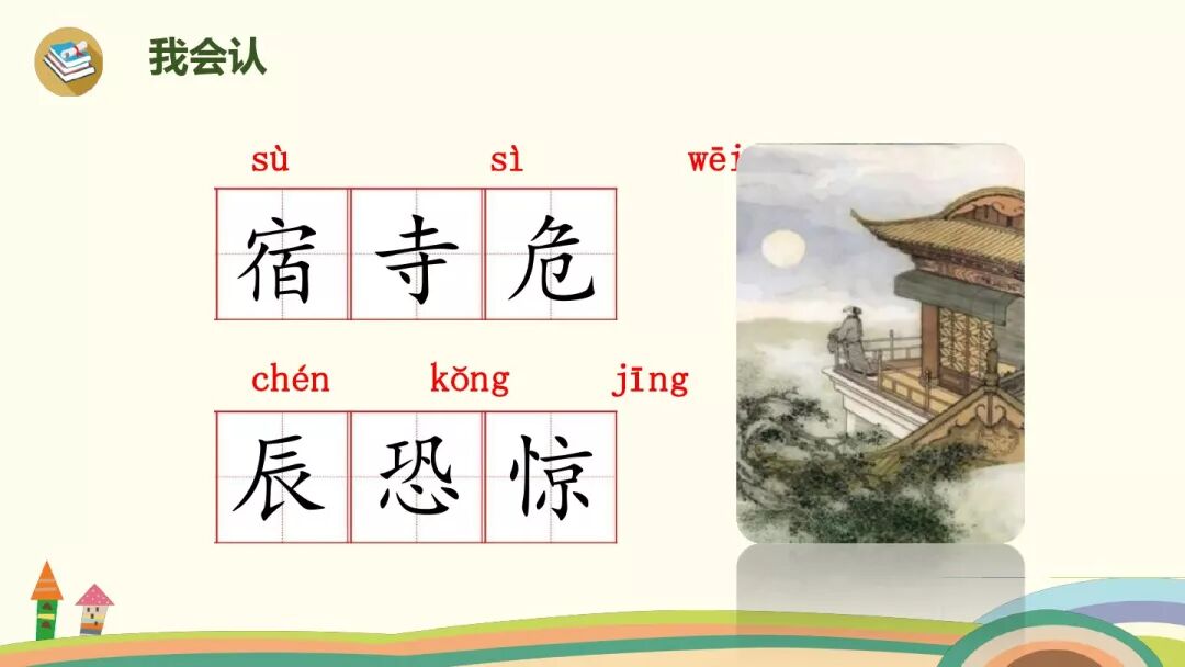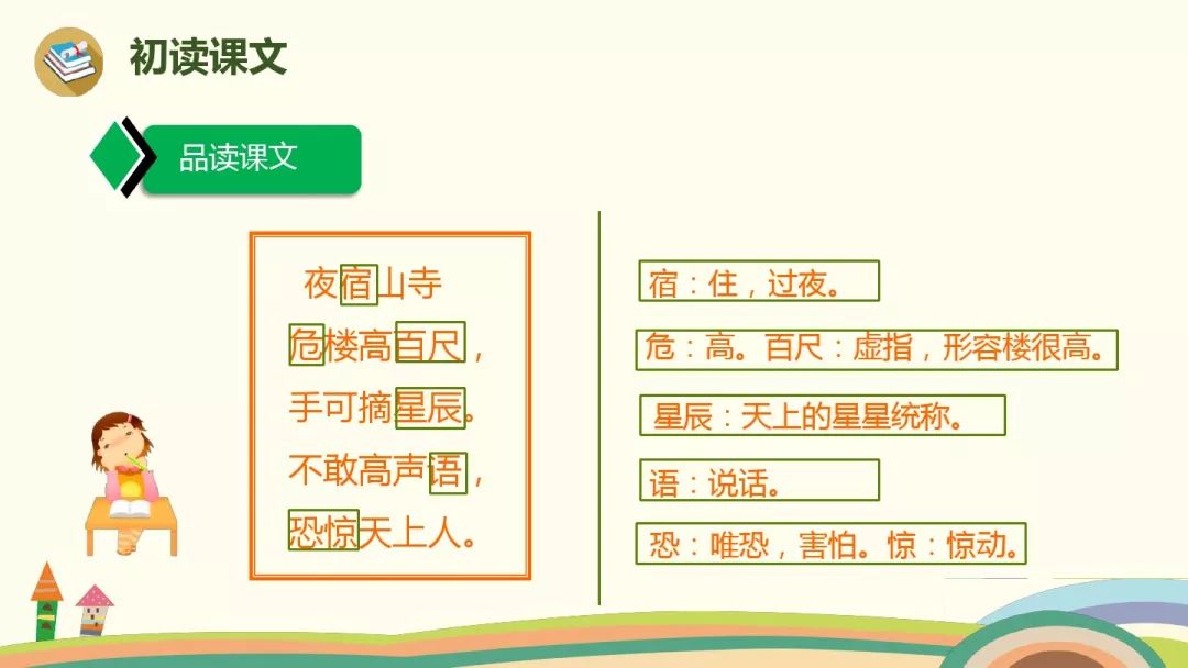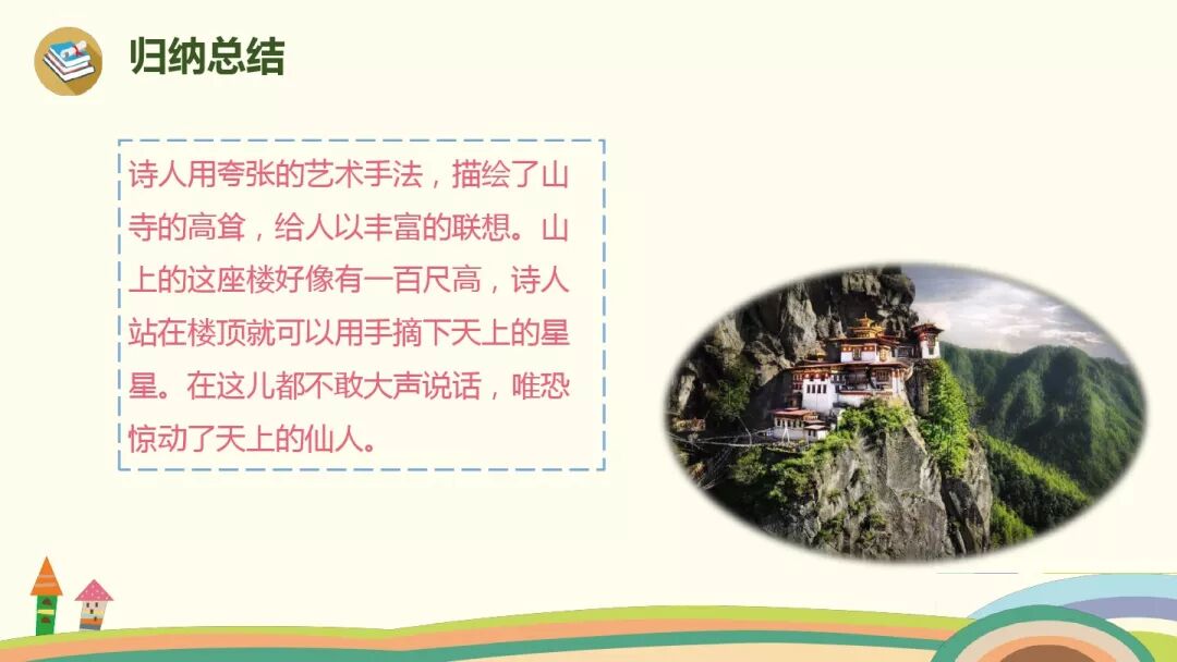 1.《夜宿山寺》:山上寺院的高楼真高啊,好像有一百尺,人在楼上好像一伸手就能摘下天上的星星。站在这里,我不敢大声说话,唯恐(害怕)惊动天上的神仙。