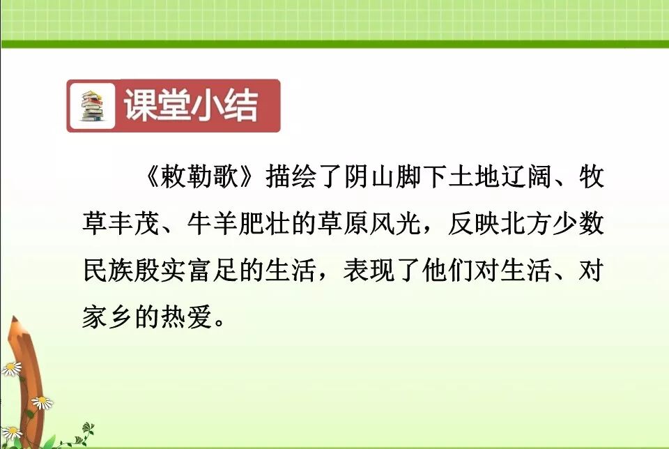 《敕勒歌》描绘了阴山脚下土地辽阔、牧草丰茂、牛羊肥壮的草原风光,反映北方少数民族殷实富足的生活,表现了他们对生活、对家乡的热爱。
