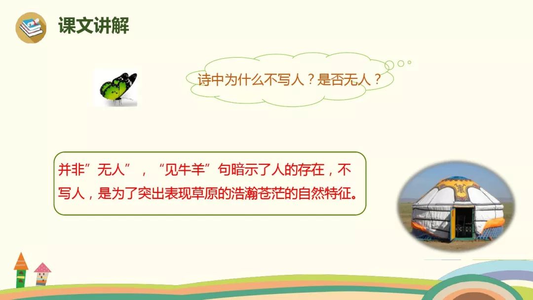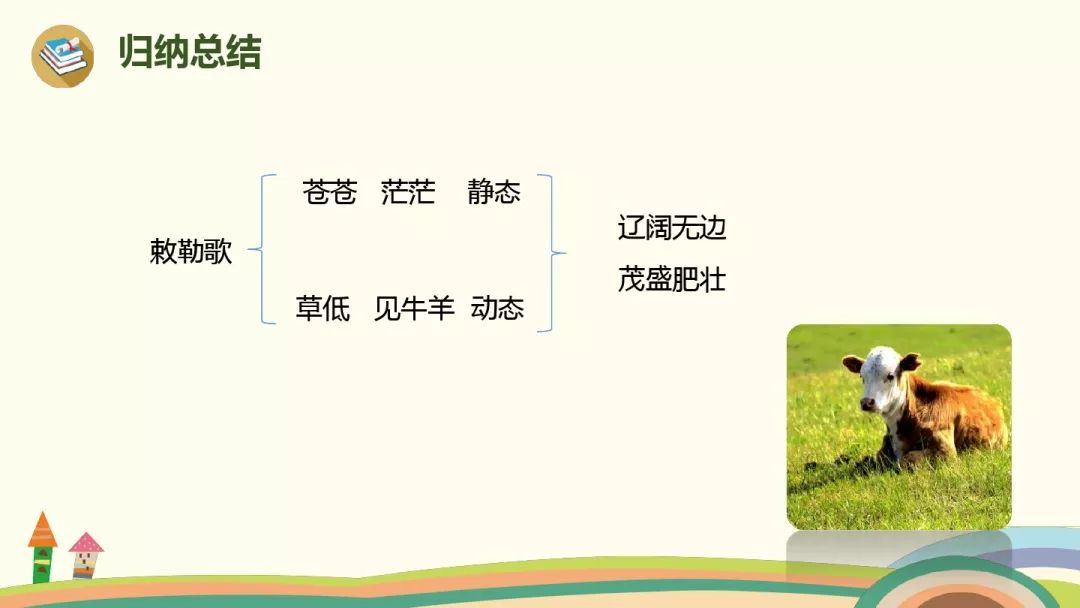 写了大草原、阴山、天空、草、牛羊等景物。给我们呈现了广阔壮美、空旷高远、草木茂盛、牛羊肥壮的美丽图画。