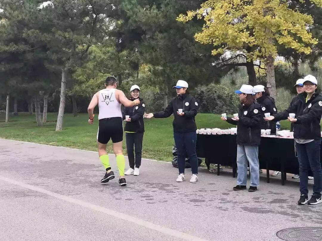 赛道补给站的工作基本上就是给运动员们递上功能饮料或者矿泉水,志愿者们手持一次性纸杯,为每一位经过的运动员加油助威,运动员们在气喘吁吁的同时仍不忘对志愿者们说声“谢谢”,或者竖起大拇指,这犹如一股暖流注入志愿者们的心中。