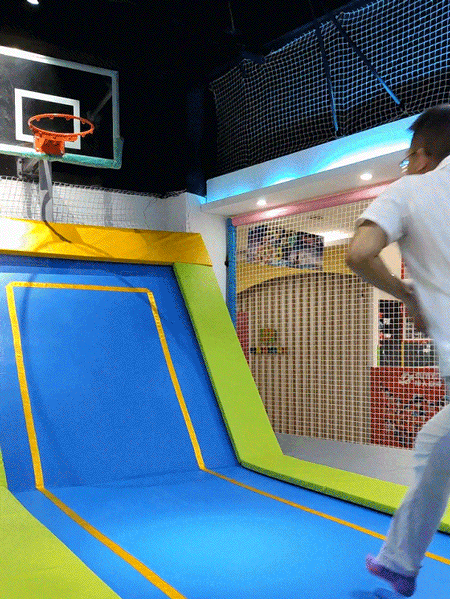 在弹性超强的蹦床上进行灌篮借助蹦床的弹力轻轻一跃