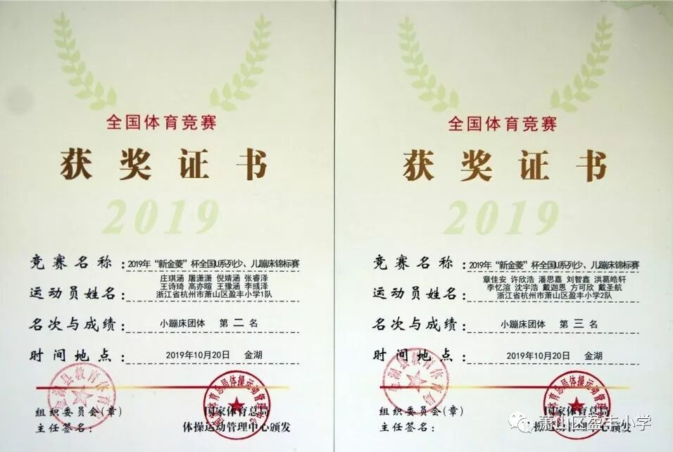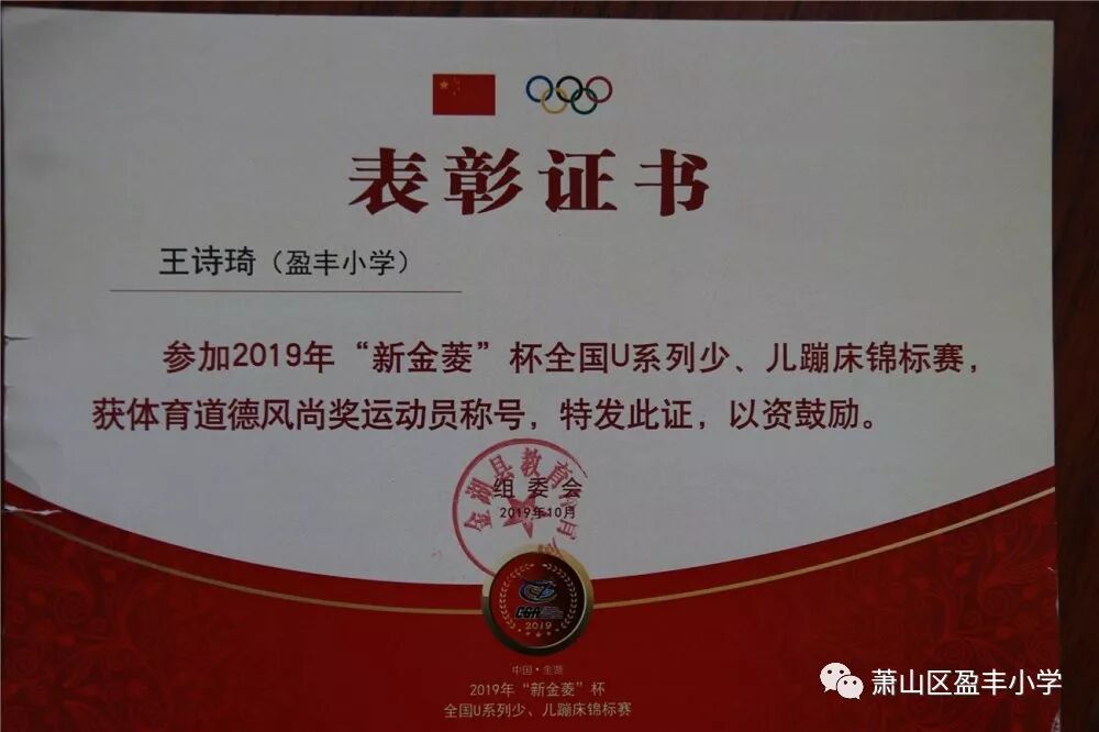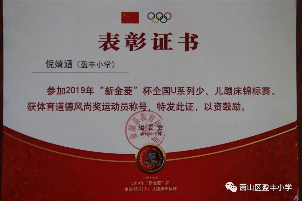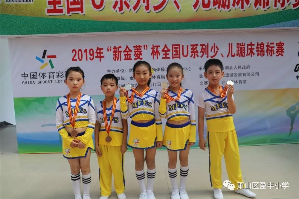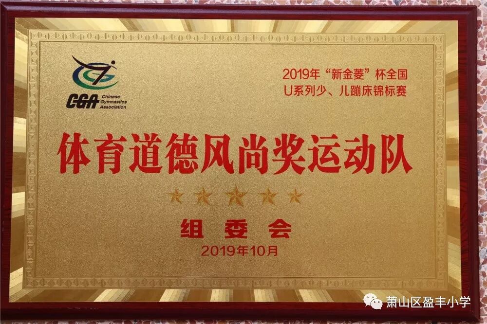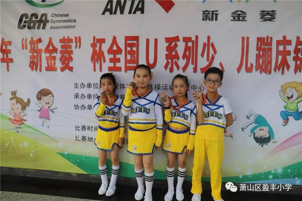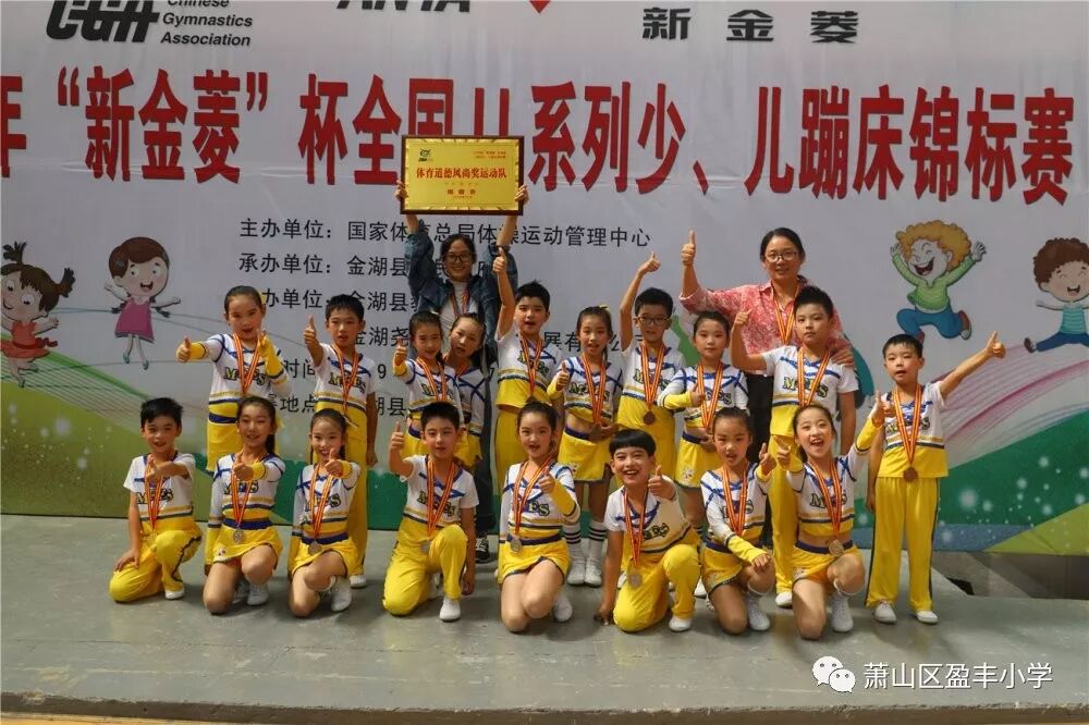 10月20日,在江苏省举行“新金菱”杯全国U系列少、儿蹦床锦标赛上,盈丰小学两支代表队喜获“小蹦床”团体第二名和第三名的好成绩,并被组委会授予“体育道德风尚奖运动队“,倪婧涵、王诗琦两位队员被评为”体育道德风尚奖运动员“。