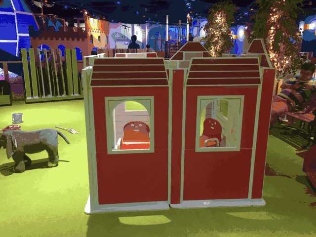 小屋大概有一人高,建好后小朋友可以选择自己喜欢的玩具放进屋子里,在屋子里玩自己喜欢的玩具呢!