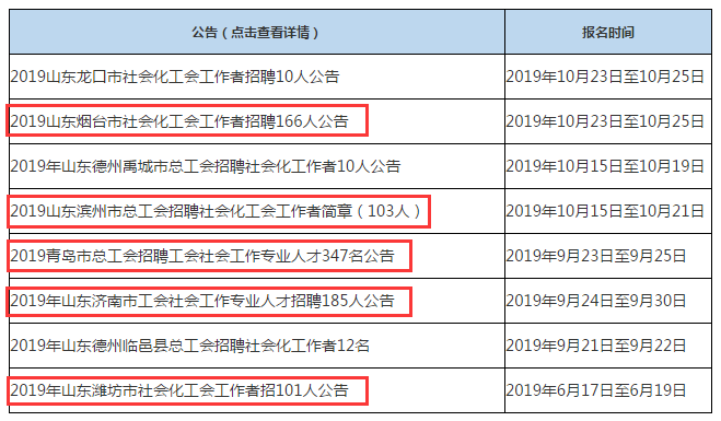 2019年下半年以来,山东省各市陆续在出工会公告,省总工会、省民政厅、省人力资源社会保障厅联合出台加强工会社会工作专业人才队伍建设的意见,明确了我省工会社会工作专业人才队伍招聘录用、薪酬保障、考核管理、激励保障等方面的具体要求。