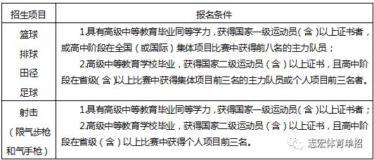篮球、排球、沙滩排球、足球(限招男生)、游泳、羽毛球、乒乓球、举重、跆拳道、拳击、橄榄球、帆船(帆板)、赛艇、皮划艇静水、皮划艇激流回旋、击剑、射击、射箭、网球、柔道21个项目