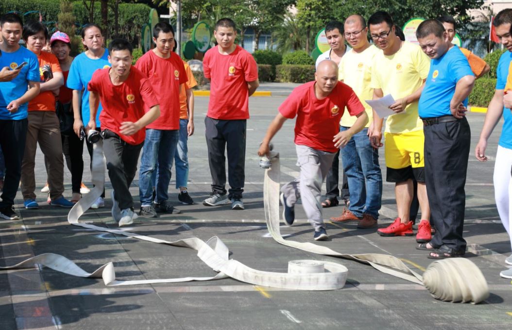 此次素质拓展共设八个项目,分别是 “消防水带接力”、“趣味投篮”、“手忙脚乱”、“竞走毛毛虫”、“趾压板跳绳”、“懒惰的自行车”、“一圈到底”、“吃鸡比赛”。活动中,裁判员精神饱满,有序地组织项目进行,参赛人员各个斗志昂扬,信心十足。“趾压板跳绳”和“竞走毛毛虫”引来了大家的阵阵喝彩,加油声连同一串串欢乐的笑声席卷了整个赛场。