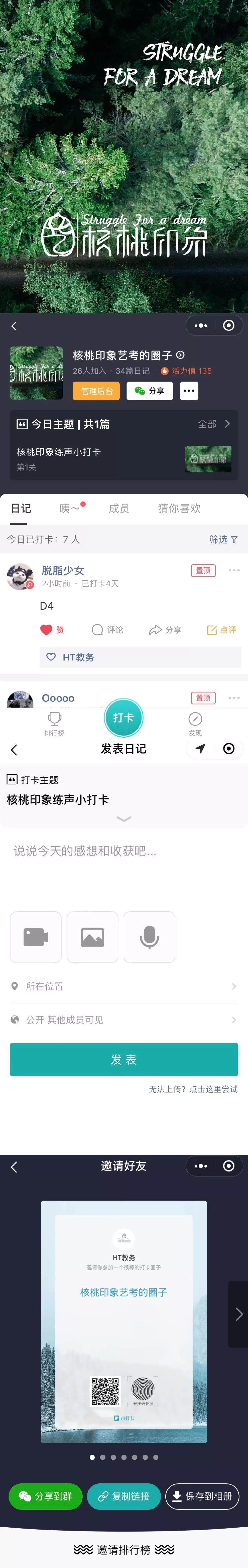 扫码进圈子——点击打卡——录音or视频——完成并转发到朋友圈