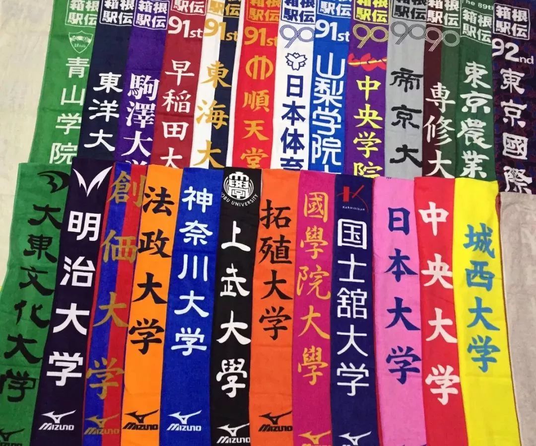 箱根驿传不似短程接力赛采用接力棒,为方便选手长跑,以代表各大学的接力带披在身上长跑。每个学校都有自己的代表色和接力带设计,接力带背面都会有队伍里所有选手、监督、教练、寮母、宿舍管理人等等的签名。将写着所有人的名字、被前面队友汗水浸湿的校带从头传递到尾,可以说是所有选手比赛中最大的信念了。