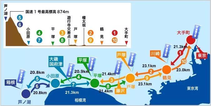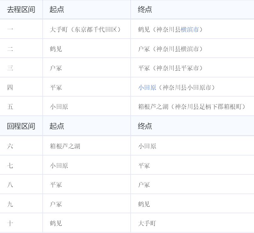 箱根驿传的去程分为五个区间(108公里),回程同样有五个区间(109.9公里),十个区间合计为217.9公里。