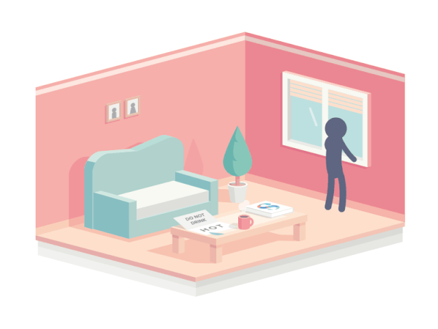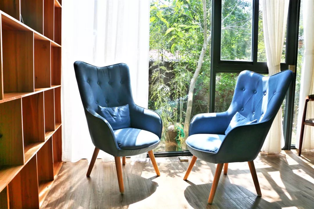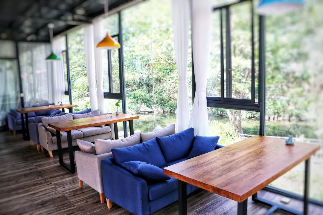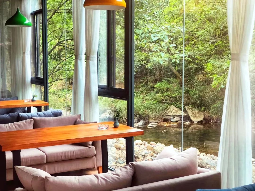 大大的落地窗外依次是清澈的河流、草坪、树林