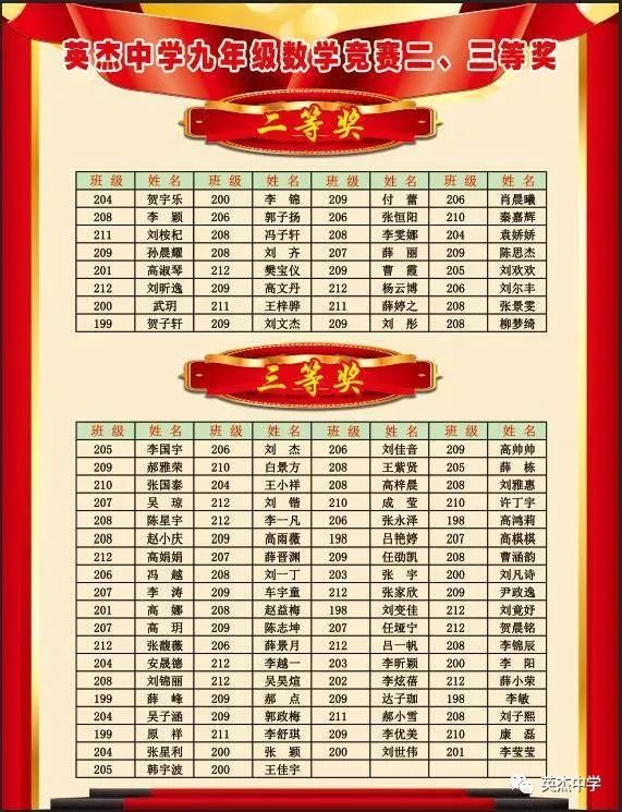 英杰中学宋新莲校长、校长助理许雅玲、校长助理李付珍、初三年级主任崔勤以及初三年级班主任和所有获奖同学参加了本次颁奖典礼。典礼仪式由初三年级副主任康长春老师主持。 大会第一项由英杰中学校长助理许雅玲老师致开幕词。她勉励获奖同学要以此作为继续拼搏、继续攀登高峰的不竭动力,勤奋学习,不断取得更大的进步。 大会第二项由初三年级主任崔勤老师宣读对竞赛获奖学生奖励的决定。 大会第三项是激动人心的颁奖仪式。 春种一粒粟,秋收万颗籽。获奖选手的的脸上洋溢着自信的魅力,眼里闪耀着智慧的光芒。夜以继日,他们奋笔疾书,顽强拼搏,用勤奋的汗水浇灌着青春之花;春去秋来,他们焚膏继晷,兀兀穷年,一页页草稿纸,一本本作业题,印证他们走过的奋斗历程。