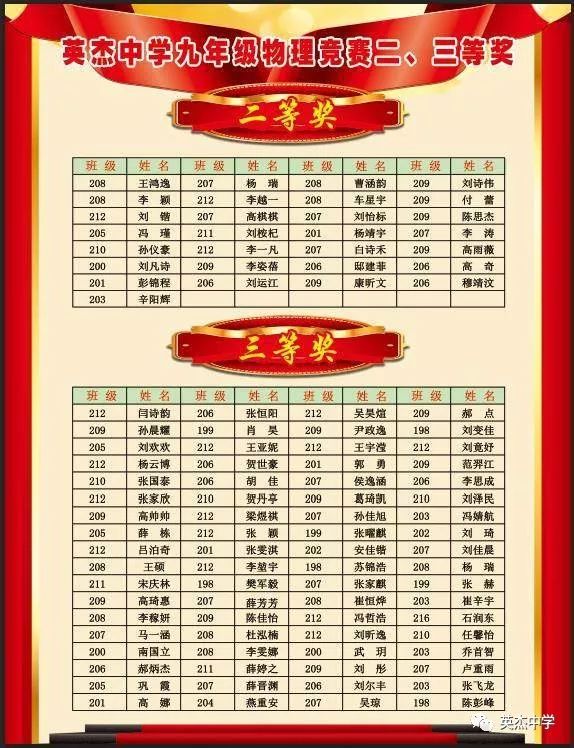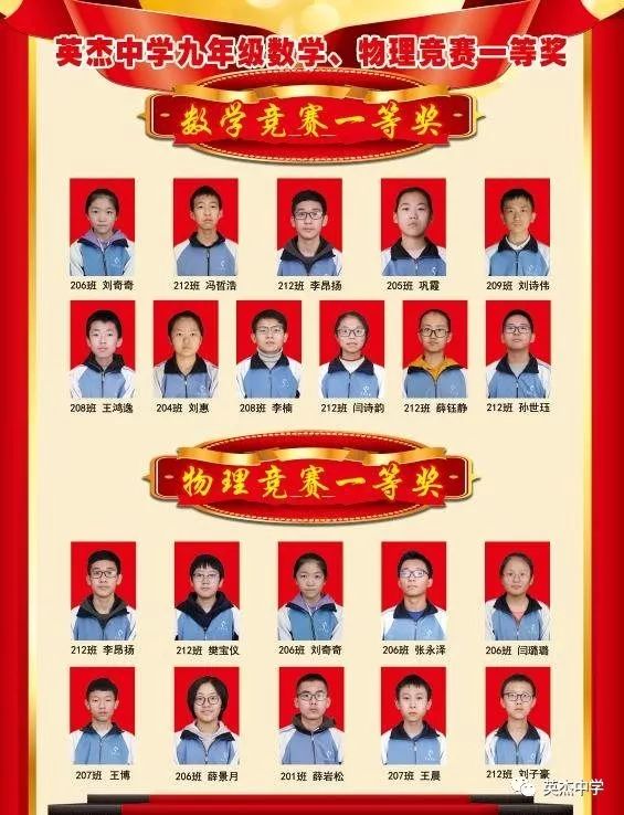 参加颁奖典礼的各位老师和数学、物理竞赛一等奖获得者合影。 当优秀成为一种习惯,未来才会有无限可能。沉着、自信、务实、拼搏,是我们每一个英杰人的标签,也是我们最为骄傲的信仰。卯足劲头向前冲,坎坷艰险不认输!这就是英杰人的精神。 本次竞赛活动激发了同学们挑战自我,表现自我的热情,营造了初三浓郁的学习氛围,为2020年中考备战拉开了序幕,“宜将乘勇追穷寇,不可沽名学霸王”,战斗的号角已然吹响,箭在弦上,初三加油!英杰加油!