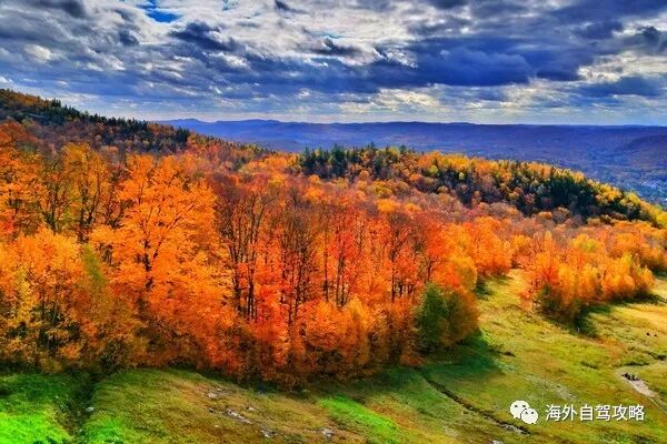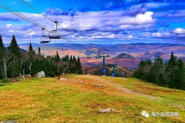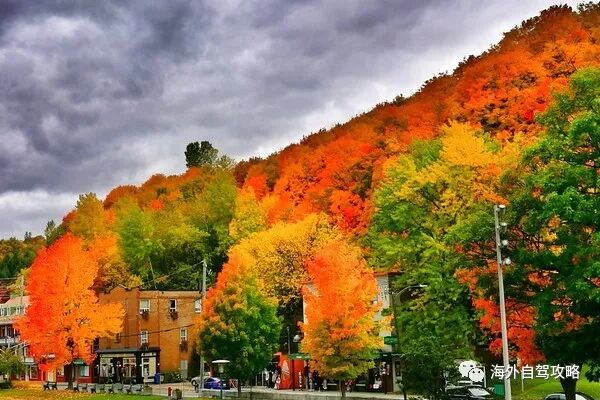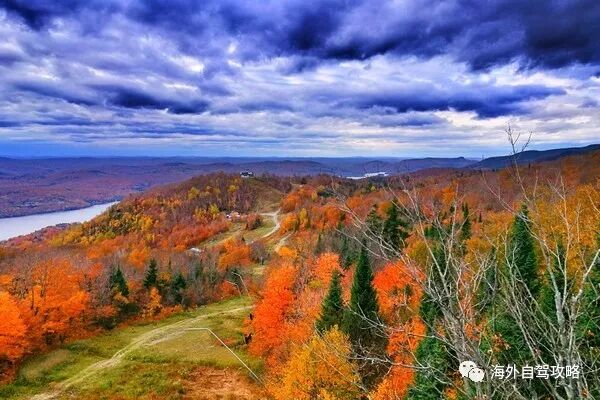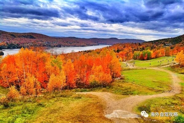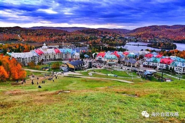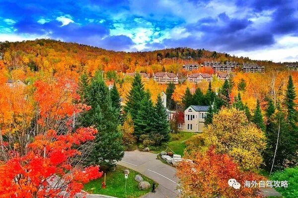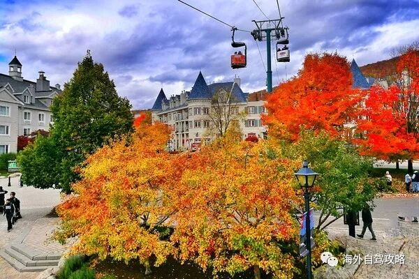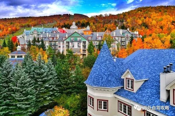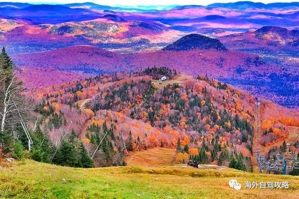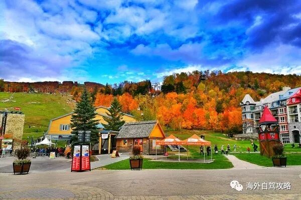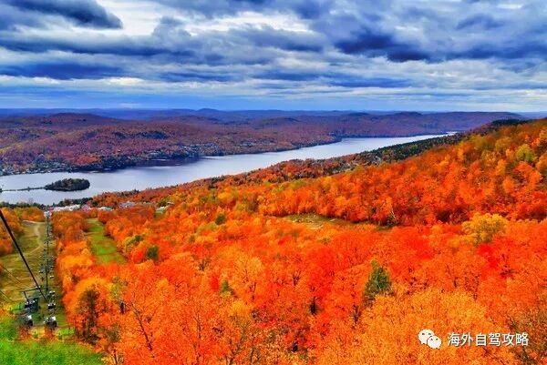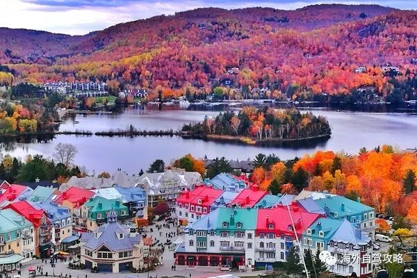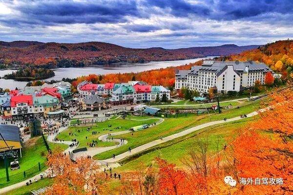 魁北克的秋色无疑令人陶醉,而靠着它不远处的蒙特朗布朗国家公园同样拥有让人无限迷恋的彩色秋林。蒙特朗布朗向以丰富的滑雪资源著称于世,优质的滑雪赛道,一流的滑雪设备,高品质的配套服务,使它成为全球最受欢迎的滑雪胜地之一。同时它也以层林尽染五彩缤纷的秋色吸引着各地的游客。一到公园,首先就会被打造得像童话一般的小镇所吸引,彩色的木屋,涓涓的流水,古堡式的酒店,精致的花园,处处都弥漫着浪漫的气息。乘上索道缆车,仿佛就像走进了巨大的4D立体动感环幕影院之中,随着缆车的不断升高,四周景色如同一幕幕天出神入化的锦绣影画不断地冲击着你的感官,未到山顶,就已然让你深感震撼。待到登上山顶极目一览,远峦近岭,万山红遍;枫丹松翠,林木尽秀;大地出彩,美景不穷,真是让人不由自主的深深陶醉其中了。