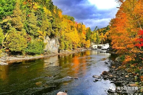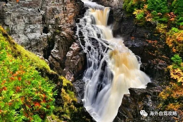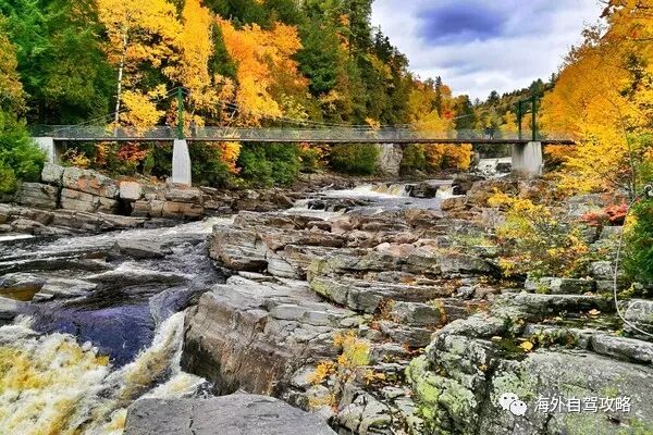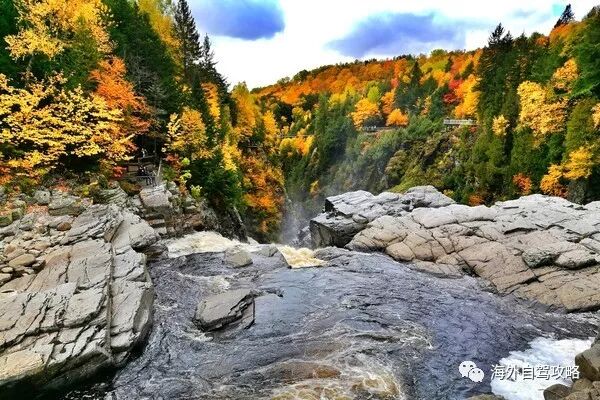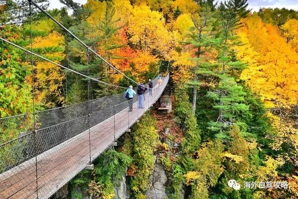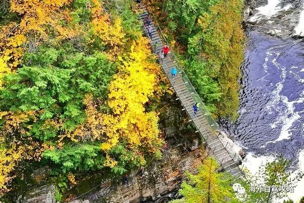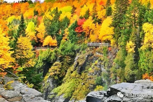 6.圣安妮峡谷(Canyon Sainte—Anne)。这条峡谷离魁北克老城很近,出城沿着圣劳伦斯河往北40公里就到。峡谷不长,景色很美,大树参天,小径通幽,悬崖峭壁衬托着深谷溪水,咆哮瀑流响彻在静美丛林,把大自然装点得如诗如画。一入秋天,满谷丹枫,满川秋水,景色更加赏心悦目。旁边的圣安妮小镇,小巧玲珑,古朴清静,秋色一样迷人。