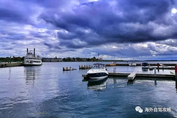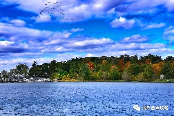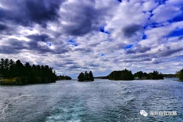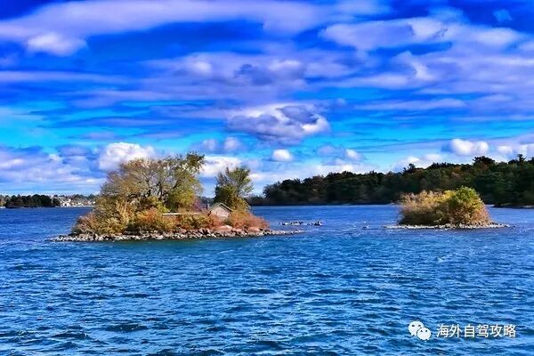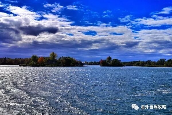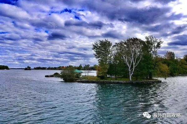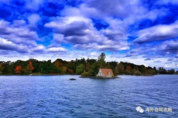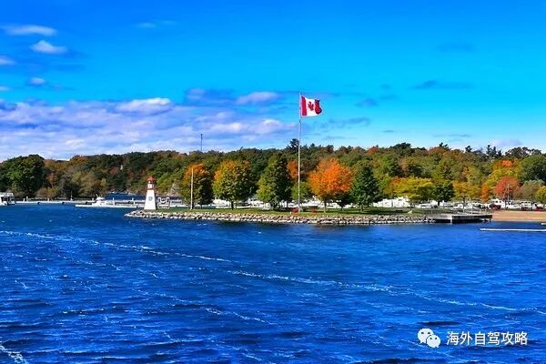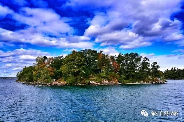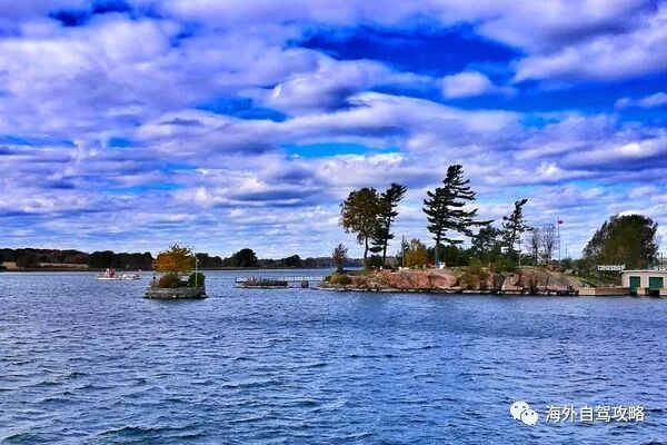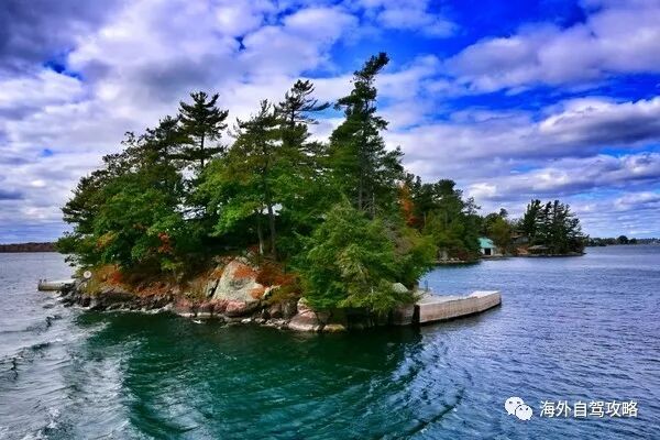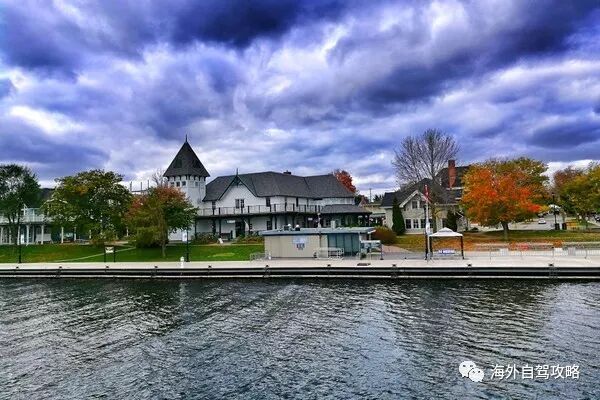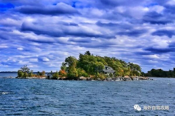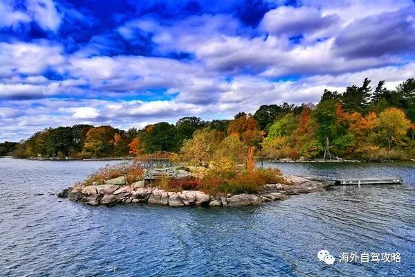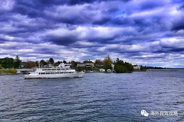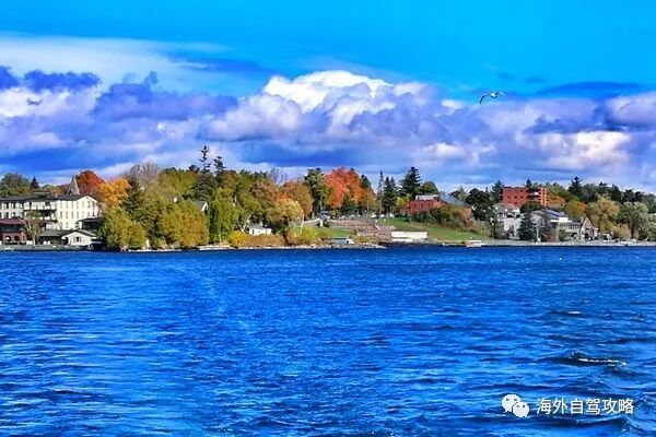 离开渥京,沿着与丽都运河平行的公路就来到了加拿大的昔日故都金斯敦。金斯敦外表看上去一如百年前简洁朴实,除了城镇规模有所扩展外,小镇风格依旧保持着古老的维多利亚式情调,街道两旁多是英式低矮老屋,整个城镇基本上看不到现代化高楼。秋天的亨利炮台公园多姿多彩,妩媚动人,可谓占尽了金斯敦小镇最美最好的秋色。我们流连于此,一时忘了归时。本想在金斯敦码头就近乘船游览千岛湖,不料这个码头秋冬游船班次很少,等待时间过长,我们只好赶去离此大约30来公里外的加纳诺克小镇码头,这边游船多,班次也多,一到即乘上游船下湖了。千岛湖实际上是指散布在加美两国之间的安大略湖与圣劳伦斯河相连河湾处的上千座岛屿,这些岛屿大到数十平方公里,小到仅一块礁石,大多数岛屿高低树木掩映,新旧别墅隐现。辽阔的湖面碧波荡漾,秋色连天,正值深秋时节,船行其中,如入仙境,恰似神游,其乐陶陶,其趣无穷。