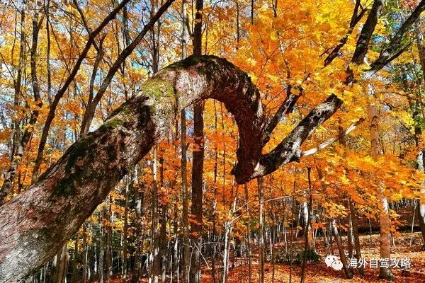 依依惜别秋水长天的千岛湖,我们连夜赶到了亨茨维尔小镇。小镇旁边就是著名的赏秋胜地阿冈昆省立公园。这个公园最初是作为野生生态保护区而设立的,所以公园属于多样性栖息地,园内除了多达几百种的动物及鸟类,更有上千种的树木和植物。成片密布的森林与星罗棋布的湖泊使它成为深受人们喜爱的度假天堂。更难得的是,一入秋天,漫山遍野的树木瞬间就染成了铺天盖地的彩林,呈绿叠翠的峰峦立刻化作了五彩缤纷的海洋,游人置身其中,仿若进入了一个如梦似幻的童话世界。这个公园确实很大,我们从亨茨维尔小镇转入60号公路,由西一直往东行驶上百公里,几乎横穿了整个公园南部,即使如此,也仅是游走了公园很小一部分。中途我们还依照公路指示牌先后插去了观景小径(Lookout Trail)、坎尼斯湾湖(Canisbay Lake)、铁杉崖小径( Hemlock Bluff Trail)等处赏枫,这几处自然小径全都被浓郁飘丹的秋林所覆盖,漫步其间,仿若行走在一条幽深久远的时间隧道,让我们把最美的秋天留在记忆的深处。