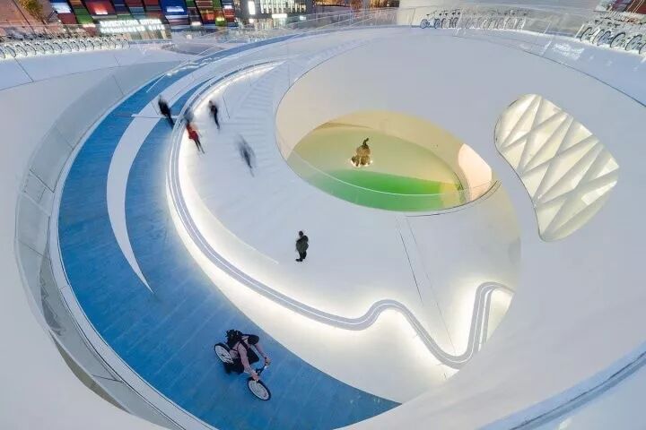 1500 辆从哥本哈根打包来的自行车,代表着两座城市在某一个时间段都曾专注过的环保出行方式,游客能骑着它们直接上到建筑的屋顶。