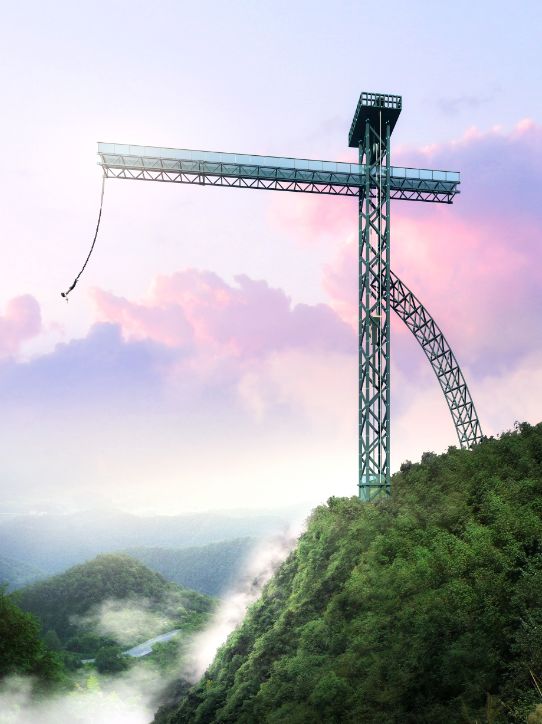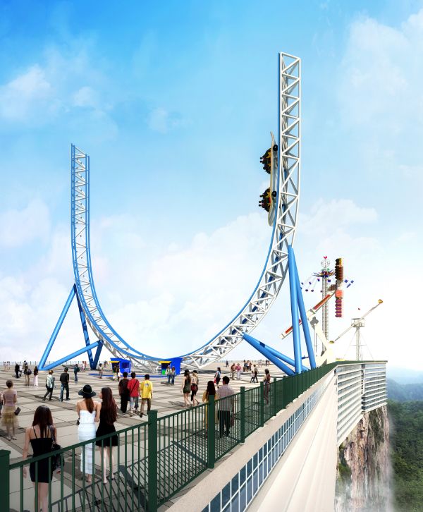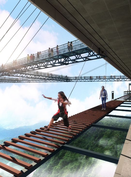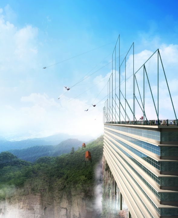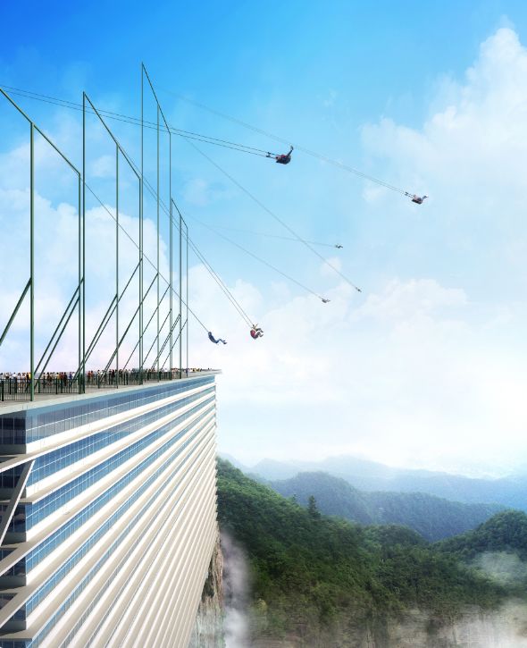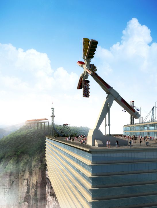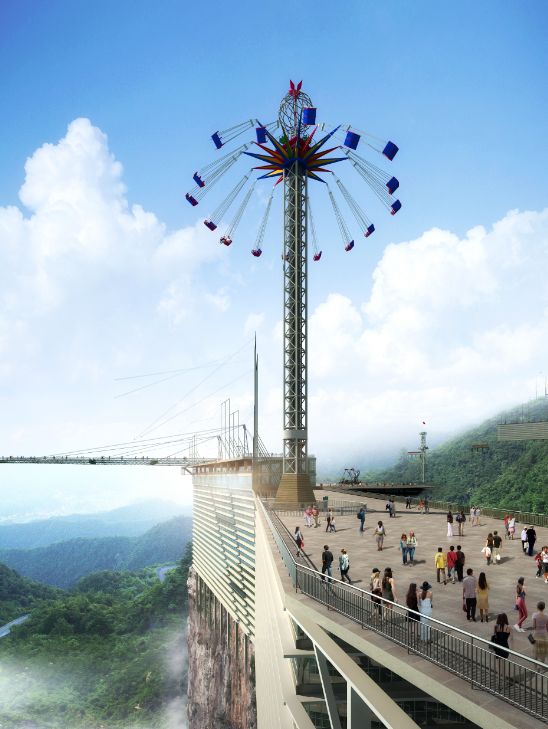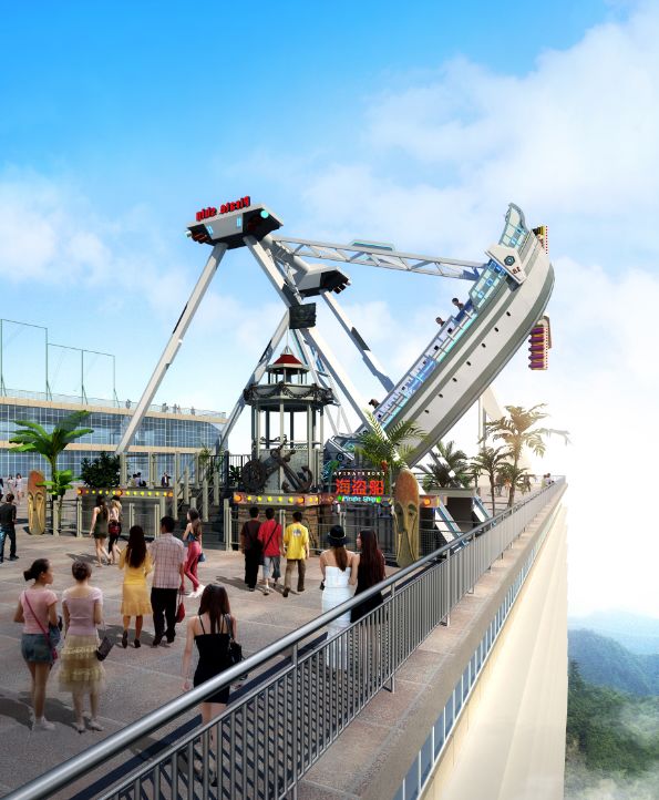 以天空悬廊、悬崖秋千、极速风车、高空飞翔、太空梭、龙门飞翔、火箭蹦极、跳楼机、高空蹦极、狂呼机、悬崖飞碟和过山车为核心构成,形成了奥陶纪独特的高空项目景区IP——