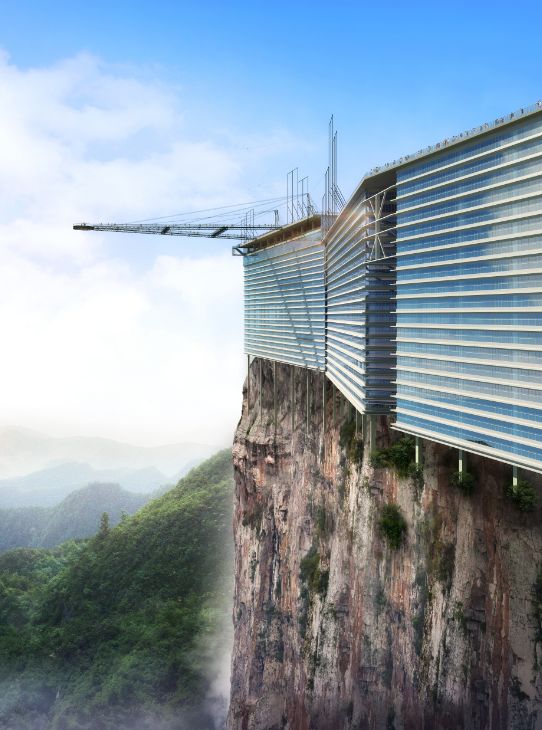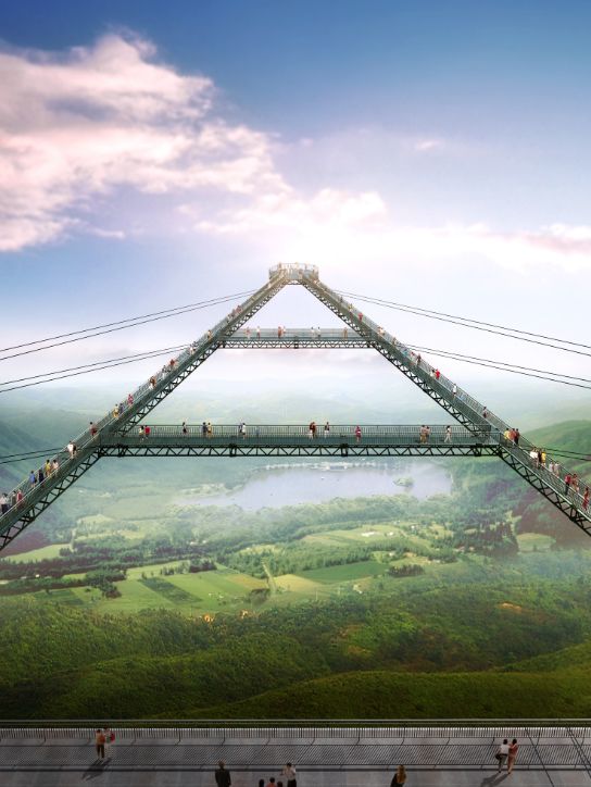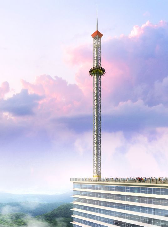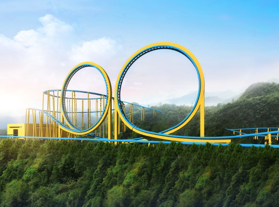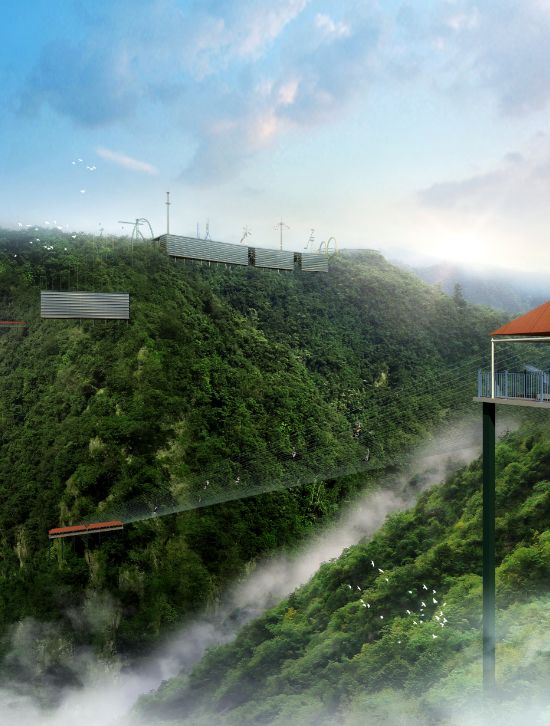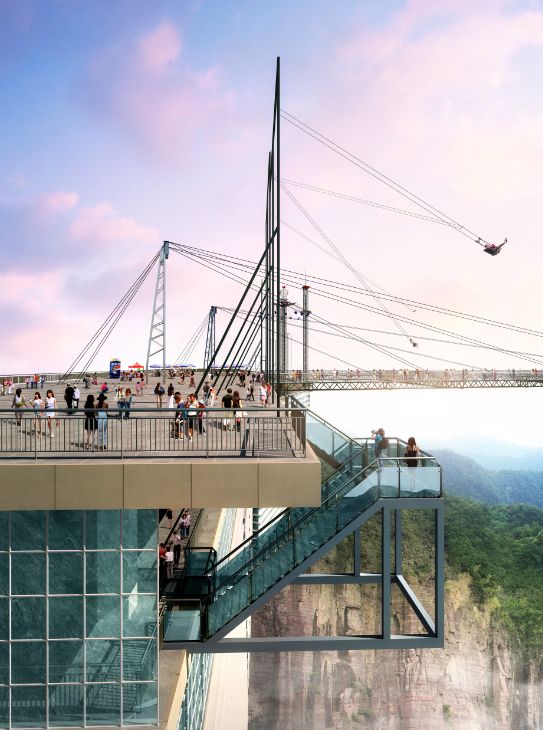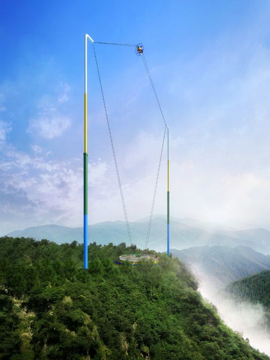 以天空悬廊、悬崖秋千、极速风车、高空飞翔、太空梭、龙门飞翔、火箭蹦极、跳楼机、高空蹦极、狂呼机、悬崖飞碟和过山车为核心构成,形成了奥陶纪独特的高空项目景区IP——