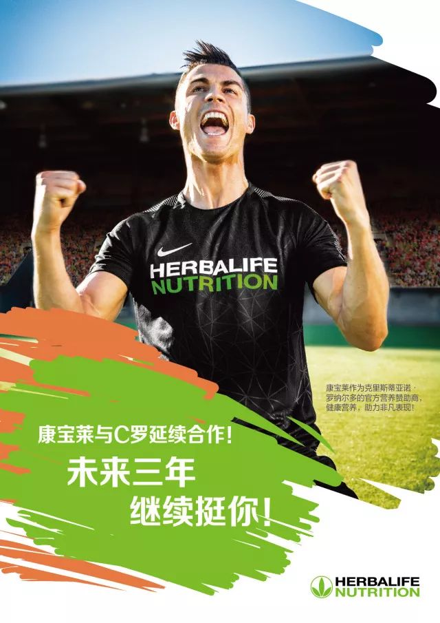 无论在绿茵场上,还是聚光灯下,世界足球巨星C罗的运动表现和身体状态一直为千万人所关注。作为C罗的官方营养赞助商,康宝莱正式宣布将延续与这位足球巨星的合作期,在未来3年中继续为C罗提供产品、科技等综合性营养指导方案。与康宝莱一起,让全世界更健康,更快乐!