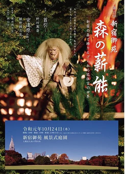 在新宿御苑葱郁树林中举办的森之薪能活动,可以一同欣赏到日本传统戏剧「能剧」与「狂言」。在篝火映照的舞台上,精挑细选的演员们将为观众献上精彩的能乐表演。平时在夜间无法入内的新宿御苑,此刻映着篝火,不妨去尽情感受下这里的梦幻舞台。