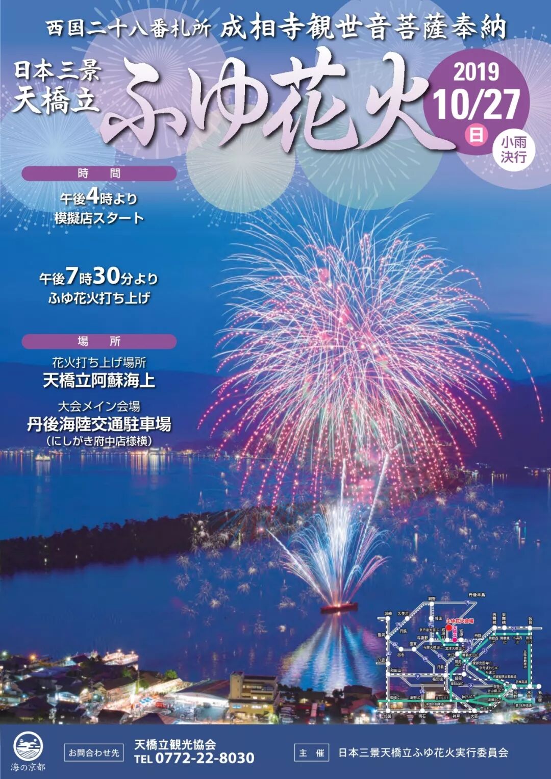 活动日期:10月27日举行时间:19:30~花火燃放※16:00~模拟店开始举办地点:京都府宮津市 メイン会場:丹後海陸交通一の宮駅駐車場 花火打上:天橋立阿蘇海上交通:从京都丹後鉄道天橋立站,乘丹海交通基線往一の宮桟橋