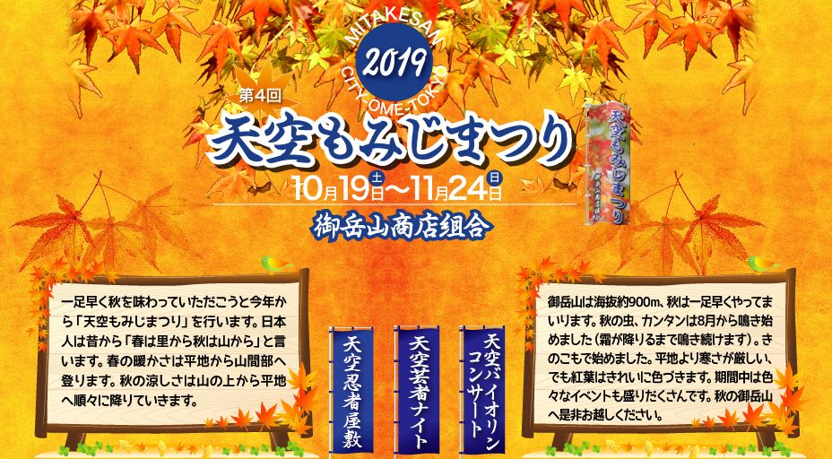 活动日期:10月19日~11月24日举行时间:各活动具体时间见官网https://www.omekanko.gr.jp/event/4415/举办地点:东京都青梅市御岳山交通:从JR御嶽站坐西东京巴士[ ケーブル下行き ]到终点站下车,从御岳登山铁道缆车滝本站乘车,到御岳山站下车步行约25分钟