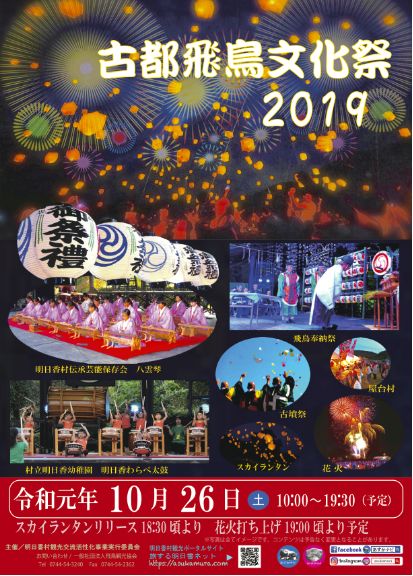 在古都飞鸟引以为傲的秋祭上,飞鸟的艺术、传统、历史、文化、农业汇聚一堂。届时有传统艺术和太鼓等表演,还有饮食摊位等各种舞台活动。作为令和元年的第一个秋祭,也将会有天灯和烟花观看。