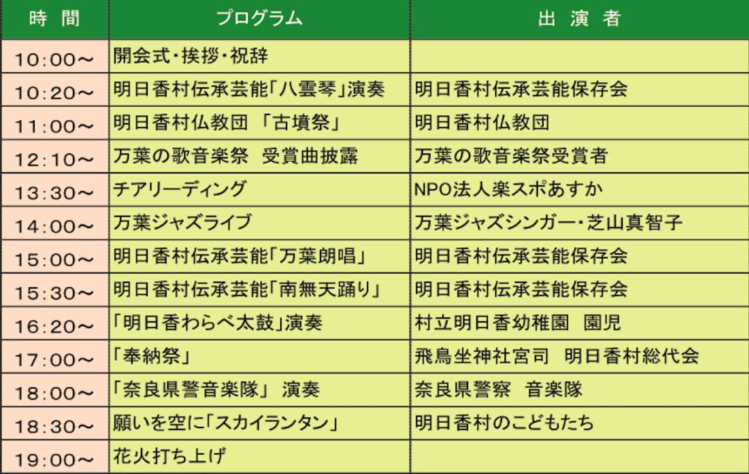 举行时间:10:00-19:30(具体活动时间见下表)举办地点:奈良县高市郡明日香村国营飞鸟历史公园石舞台地区あすか風舞台交通:从橿原神宮前站出发,有很多明日香村的观光巴士门票:免费(饮食收费)