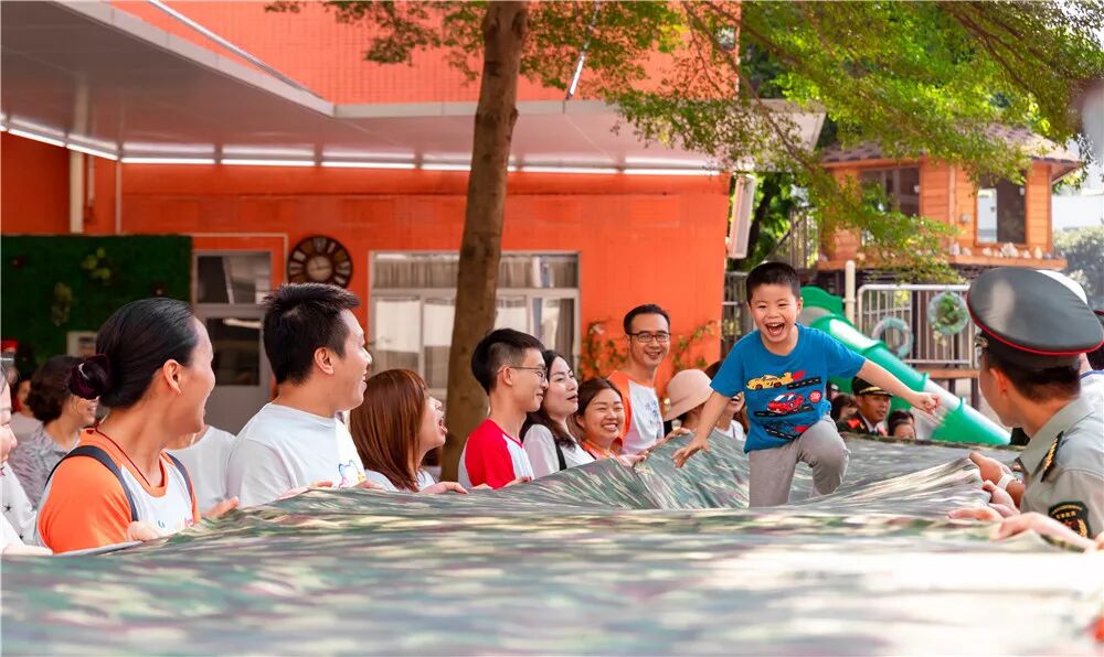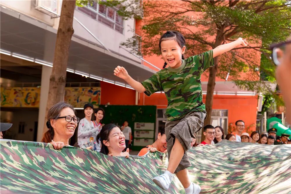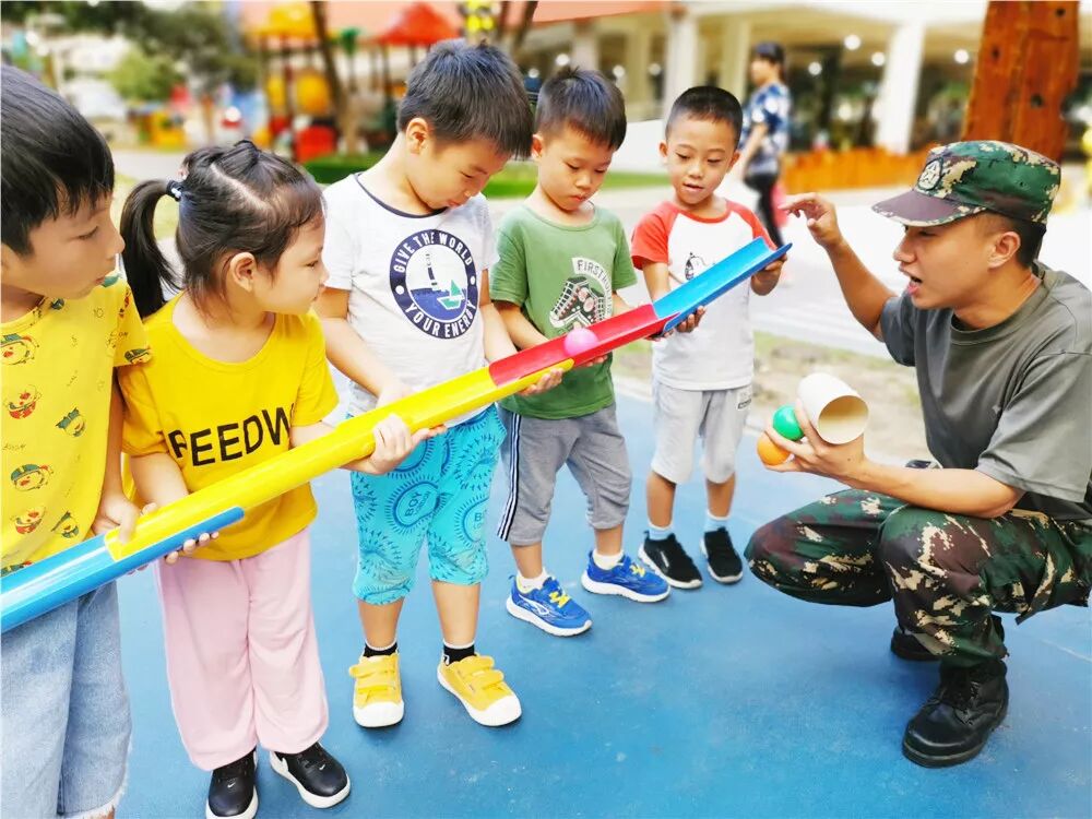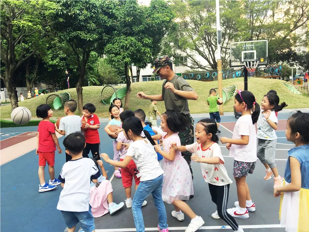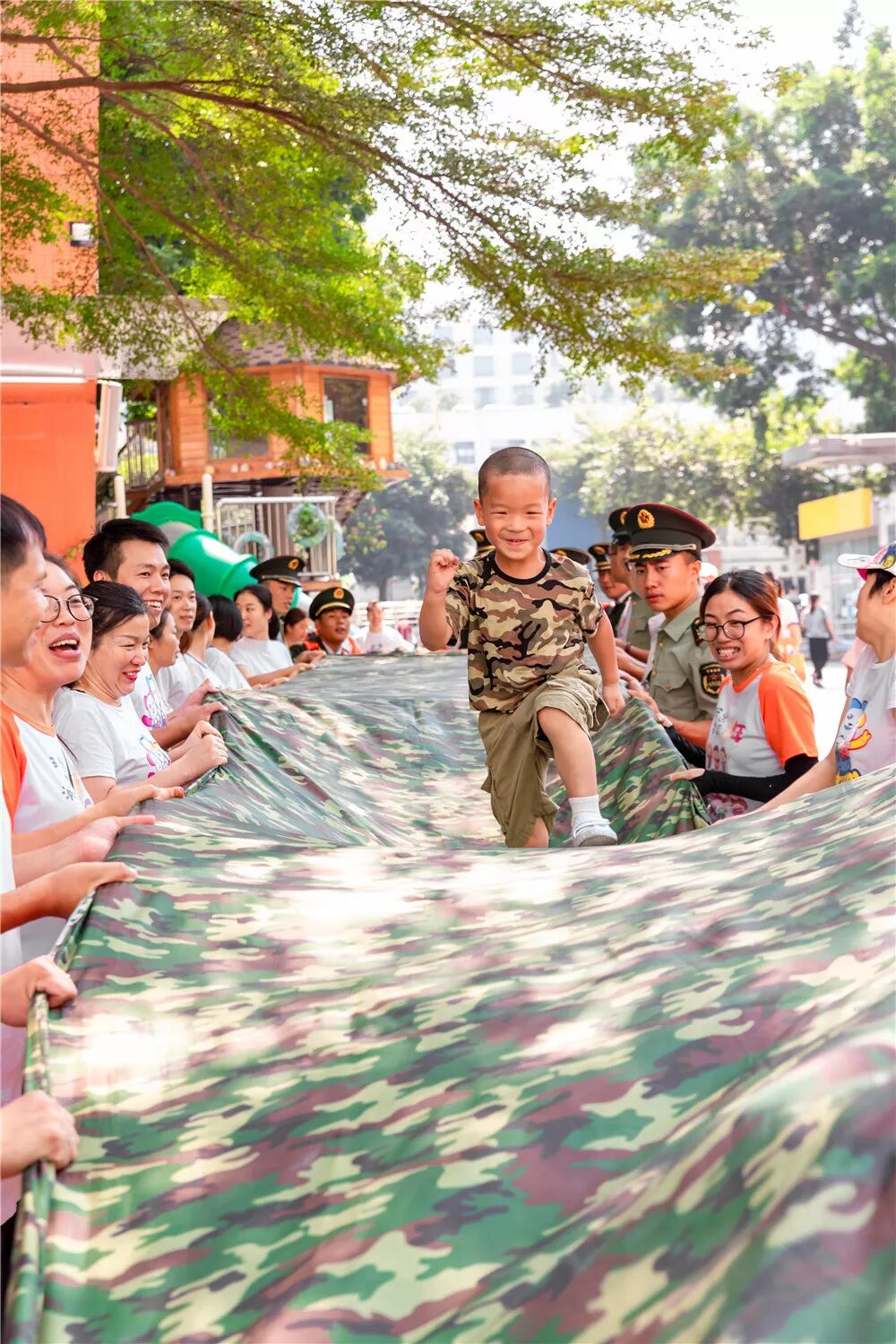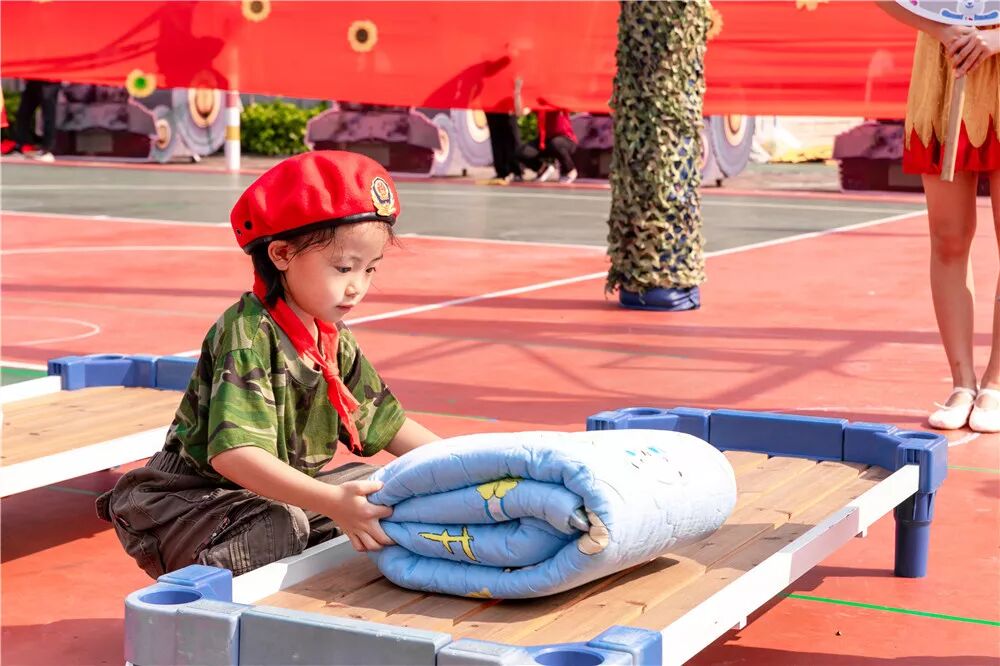 军训的十天里,孩子们每天都早早地回幼儿园,和教官们一起出操、队列训练、跳鞍马、攀爬、叠被子……小白鞋在幼儿园的球场里闪动着,清脆的童音喊着响亮的口号,汗水沾湿了孩子们红润的小脸颊……这一切都汇成了幼儿园最美丽的风景线!朝夕相处的军训时光,让孩子们变得更坚毅无畏,更能吃苦耐劳!