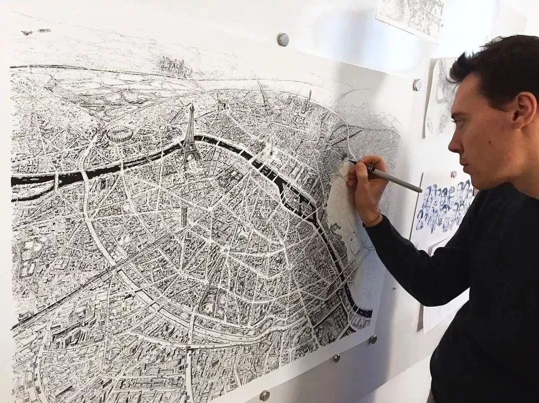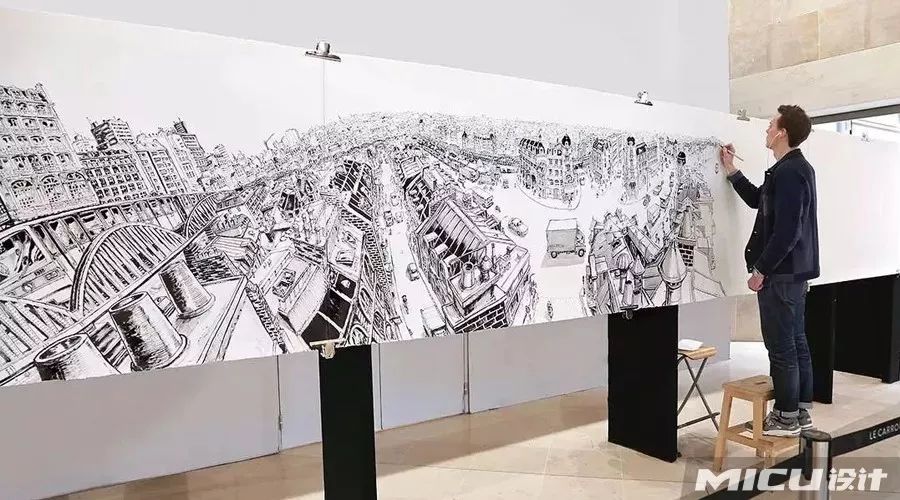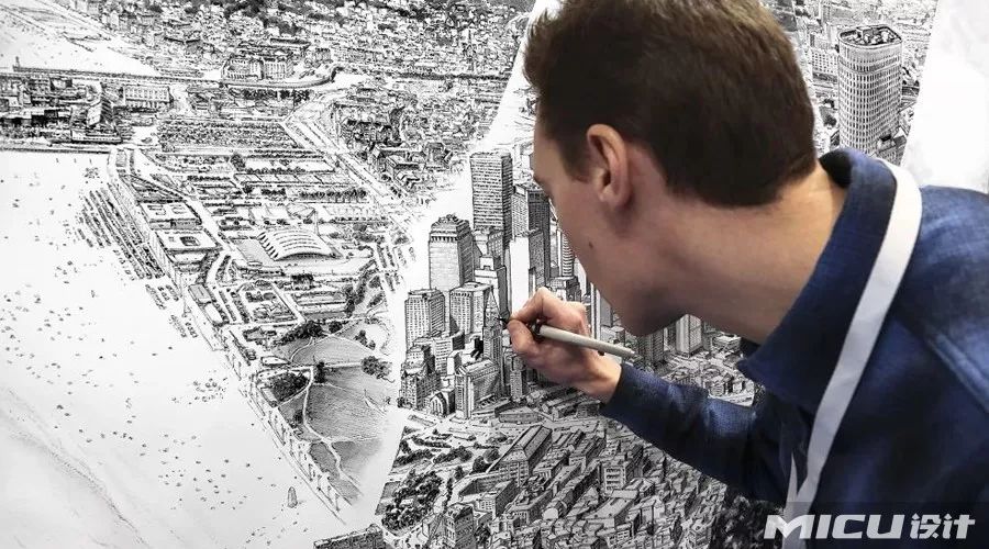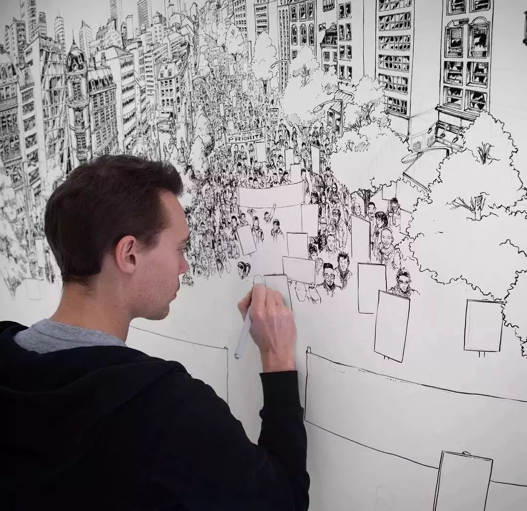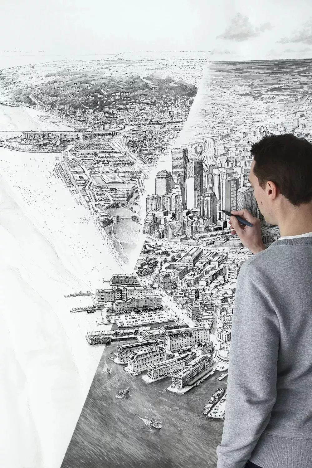 他的作品不需要任何色彩只要一支针管笔把所有的景物和建筑统统画下来