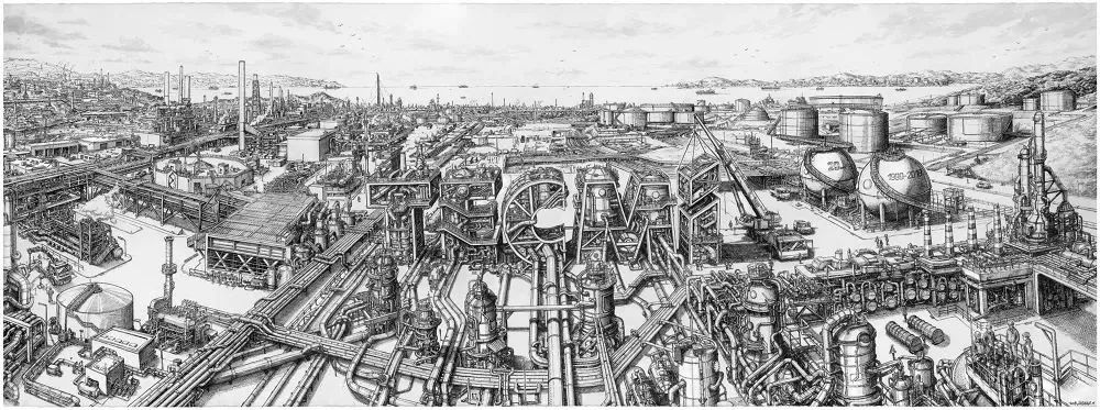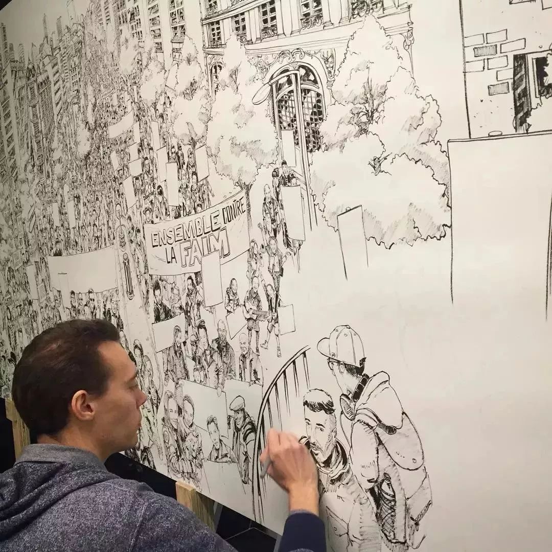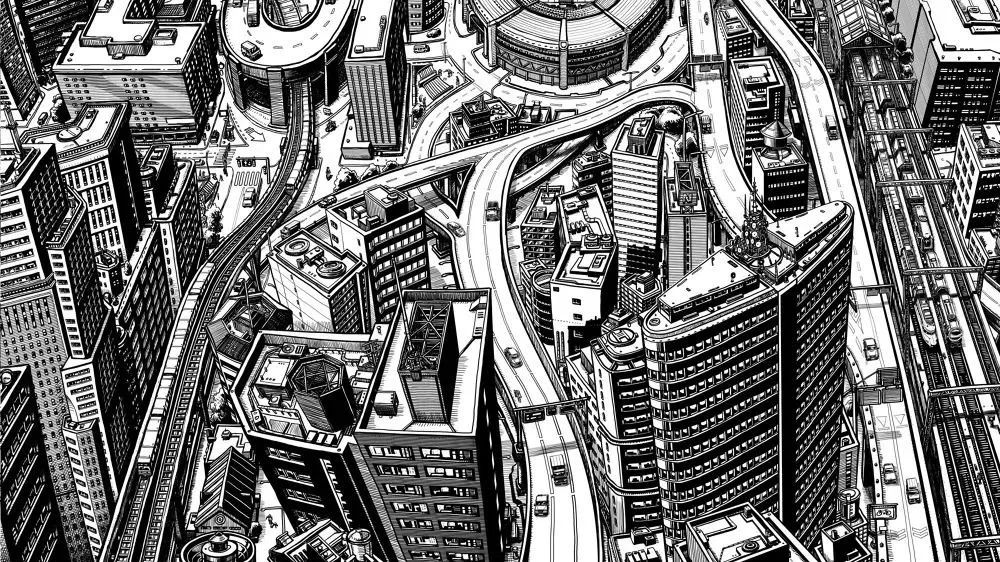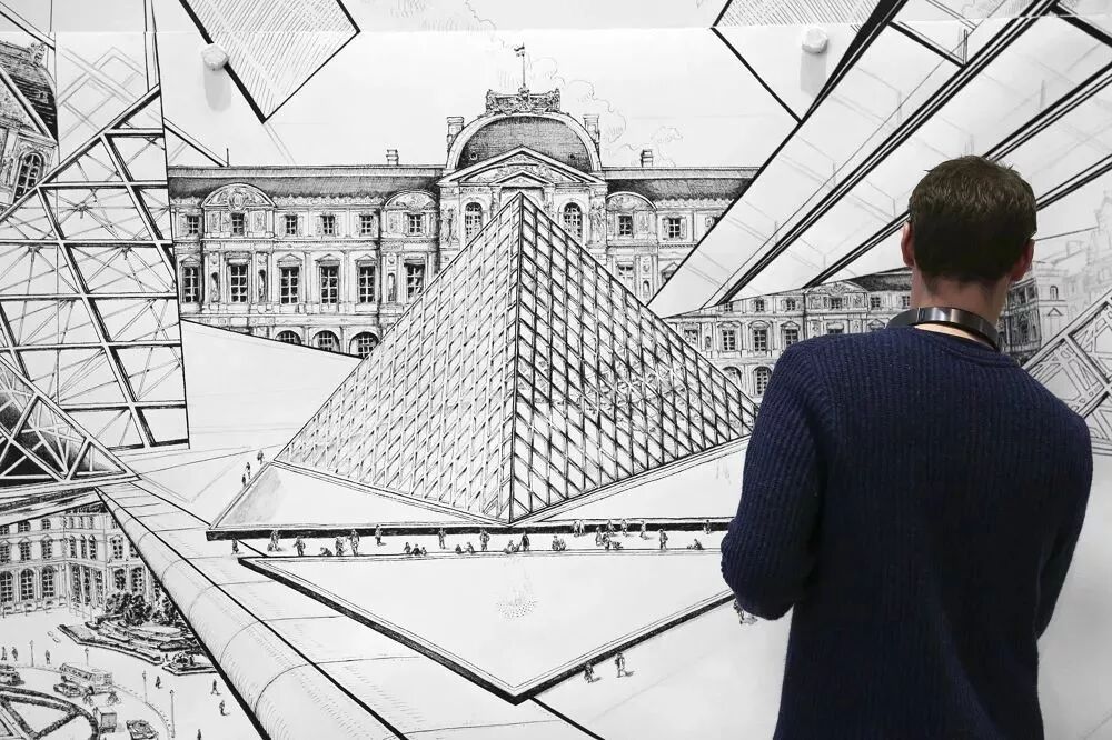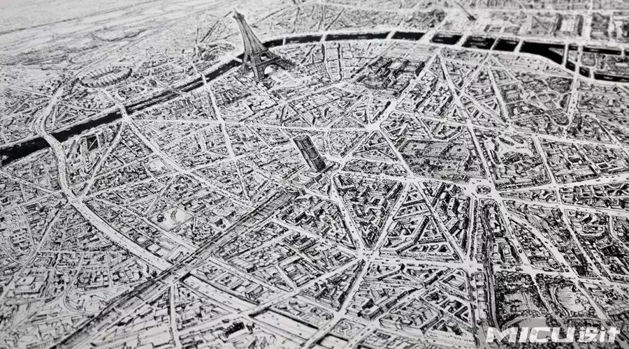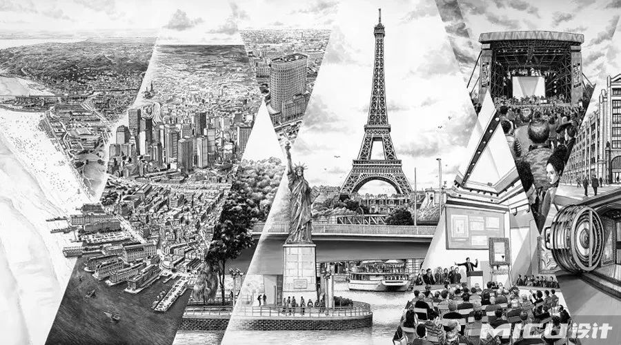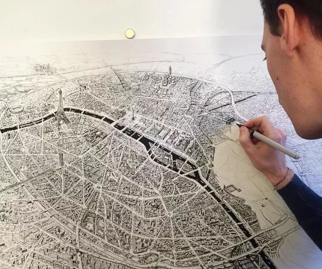 他的作品不需要任何色彩只要一支针管笔把所有的景物和建筑统统画下来
