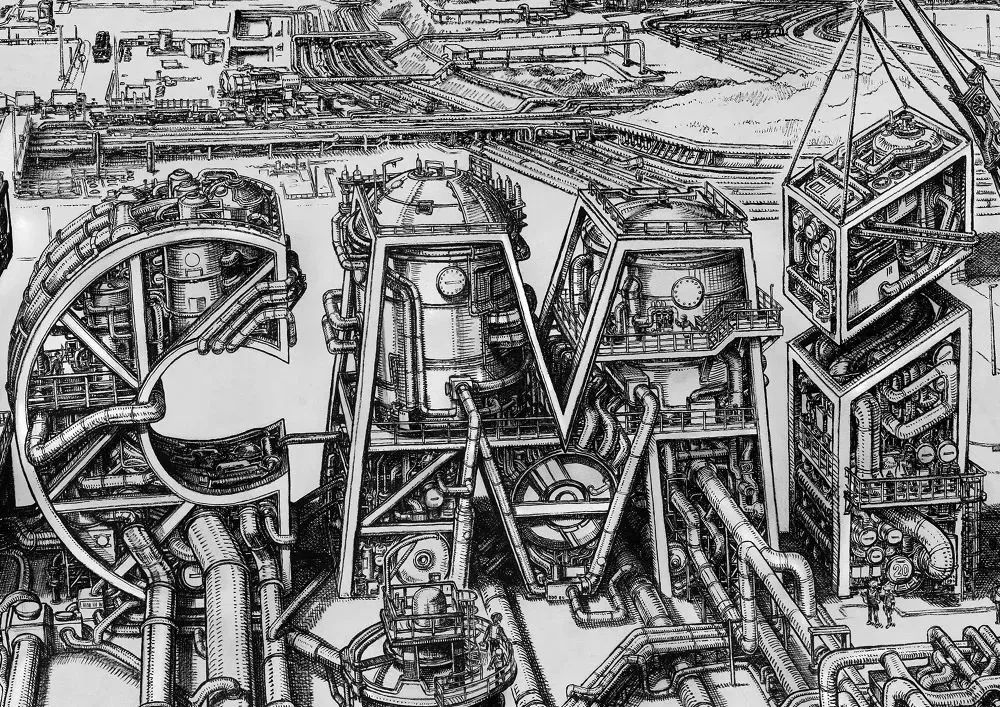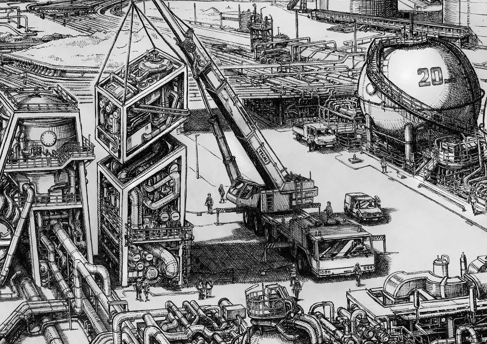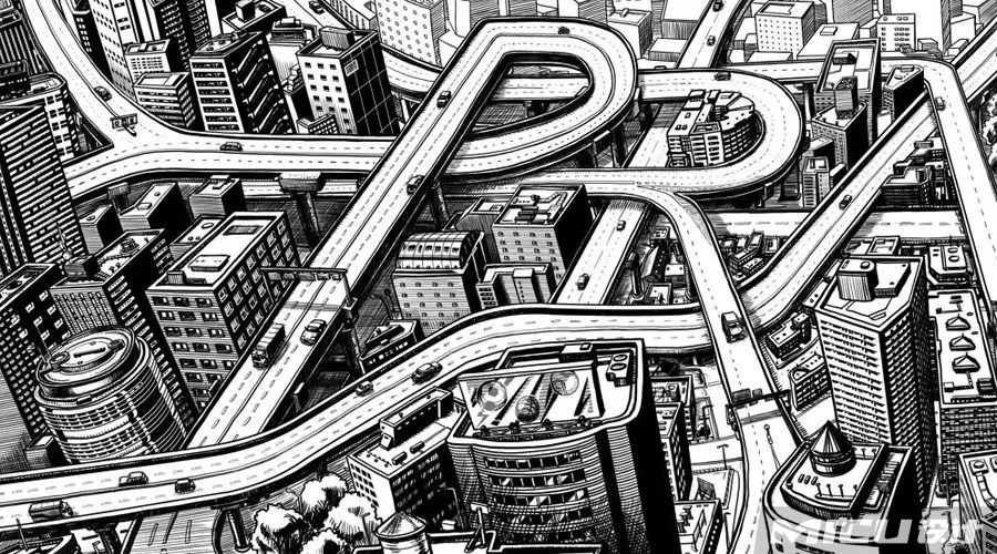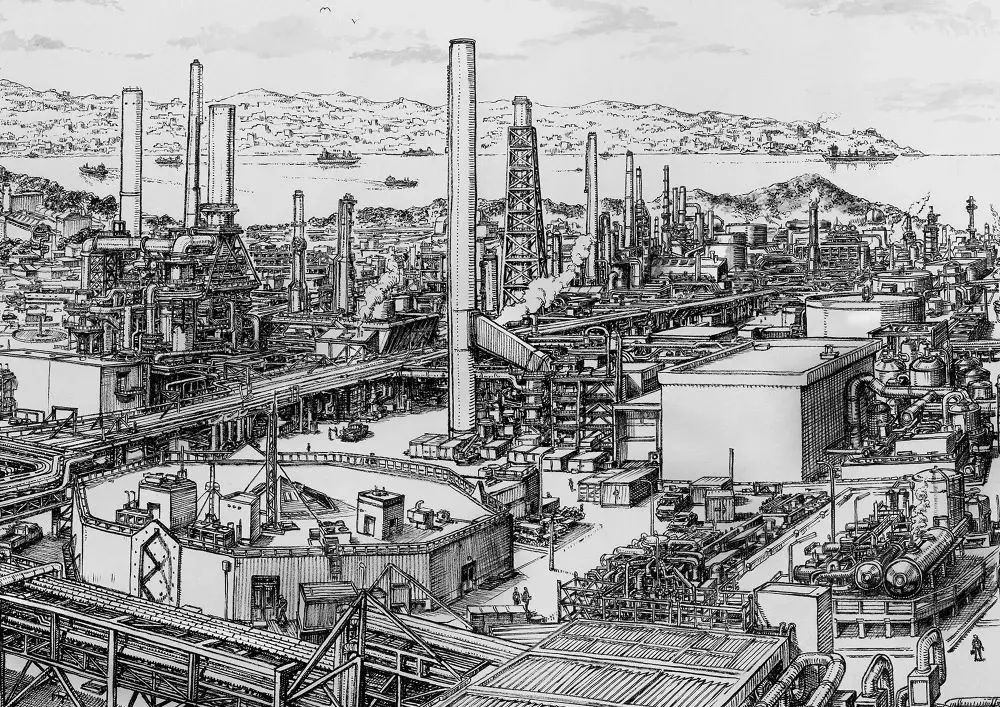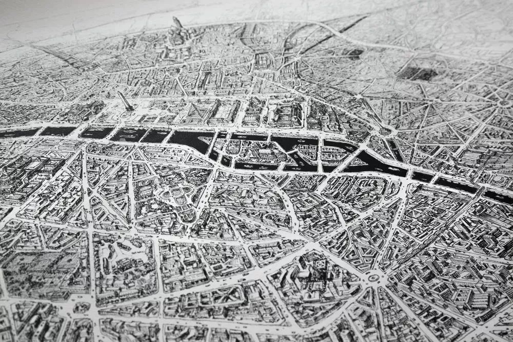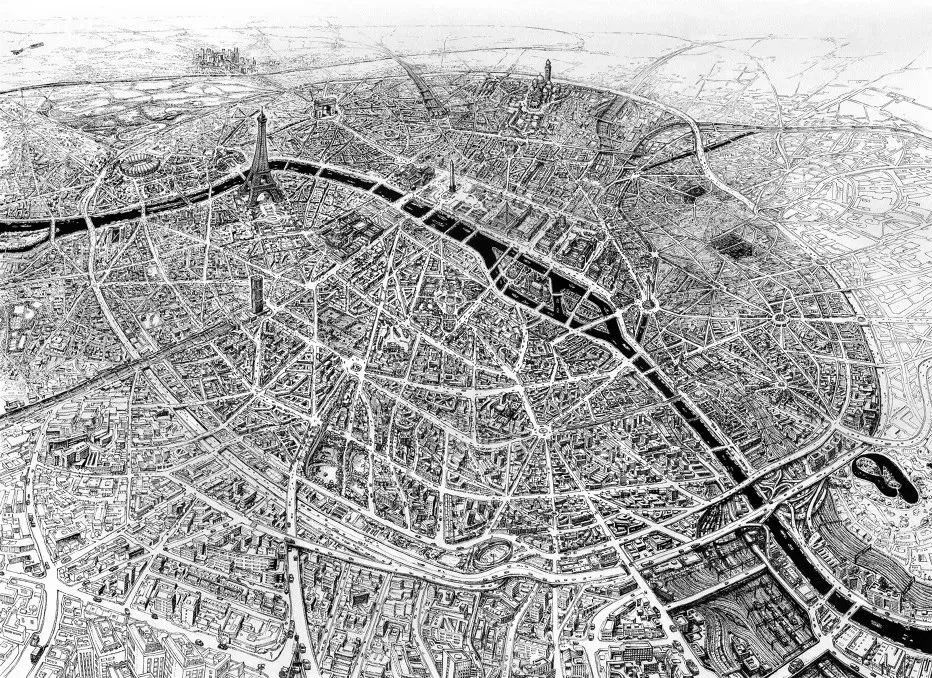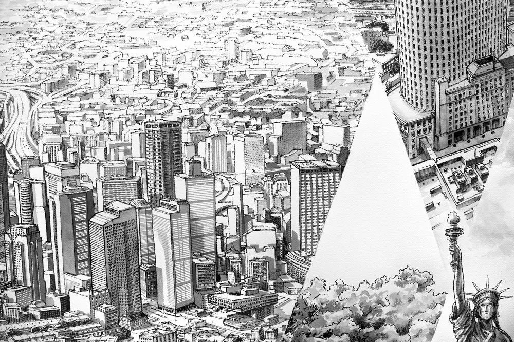他的作品不需要任何色彩只要一支针管笔把所有的景物和建筑统统画下来