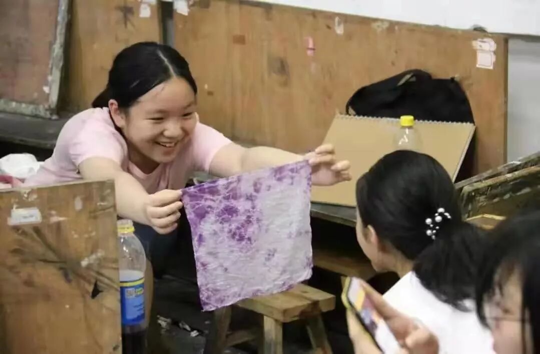为了让更多人了解与感受扎染技艺的魅力,天津美术学院产品设计学院艺染·梦彩扎染工坊志愿服务团赴浙江台州市椒江区道台里文创园、尚美画室;以及路桥区白枫岙村、下洪洋村,开展以“以艺绘心,为梦添彩”为主题的暑期社会实践,与村民们一起感受扎染的渲化之美。