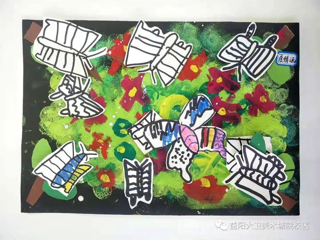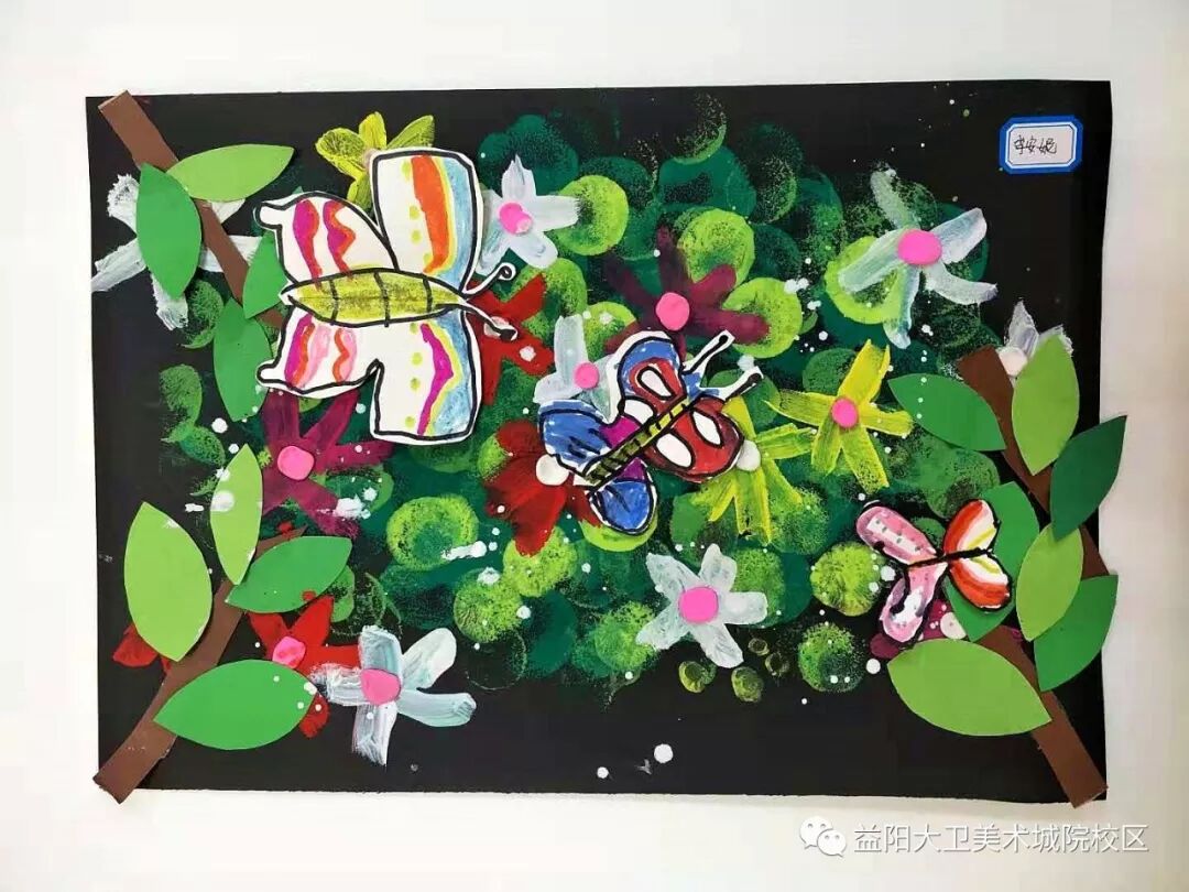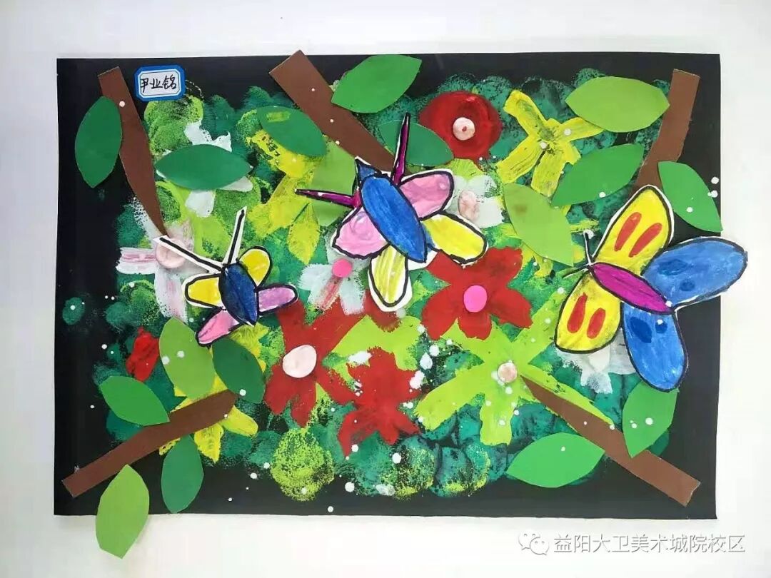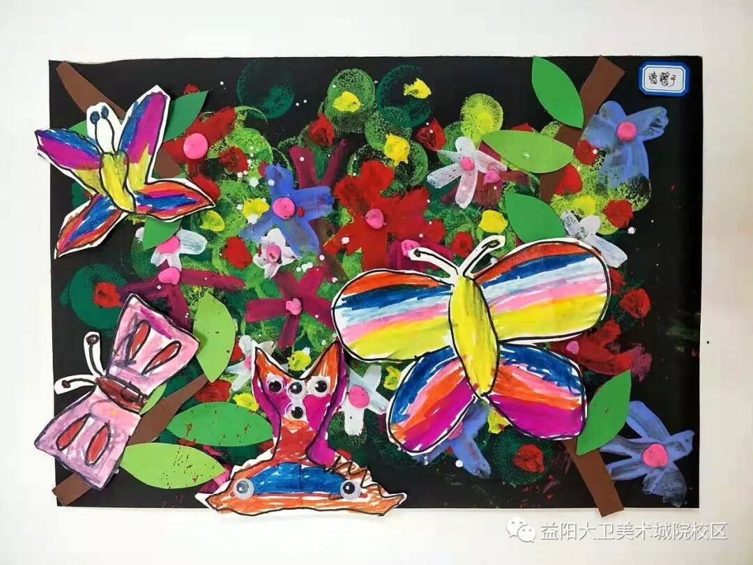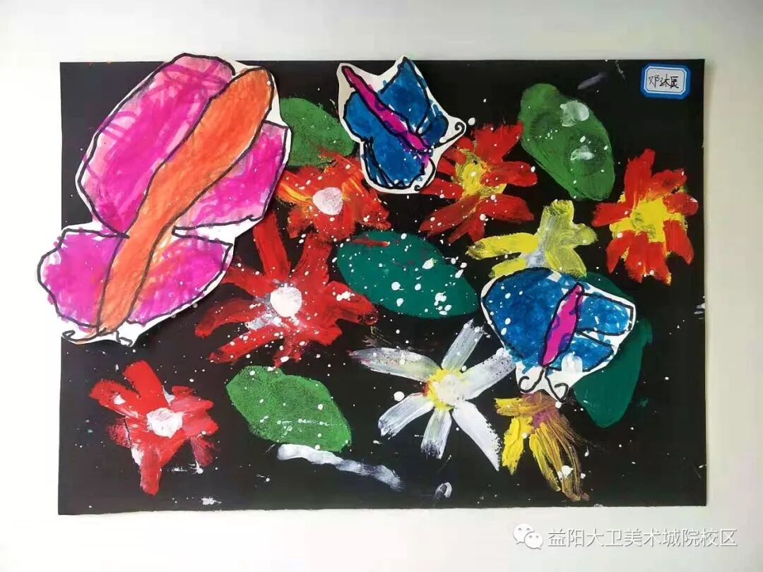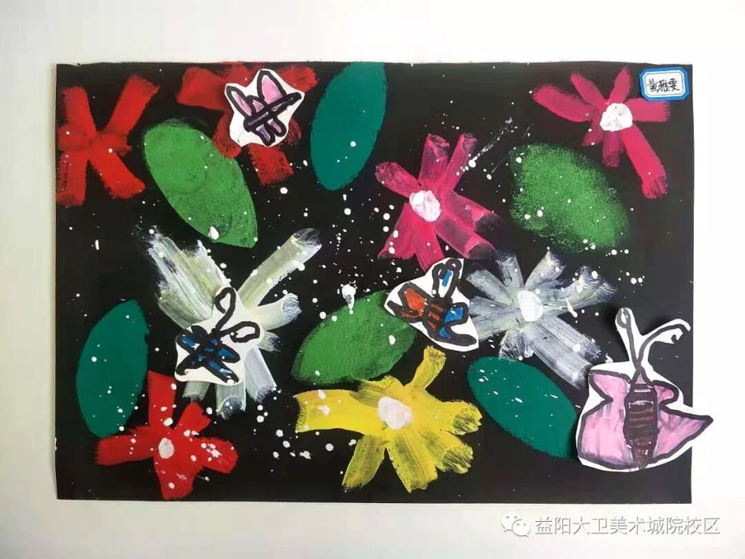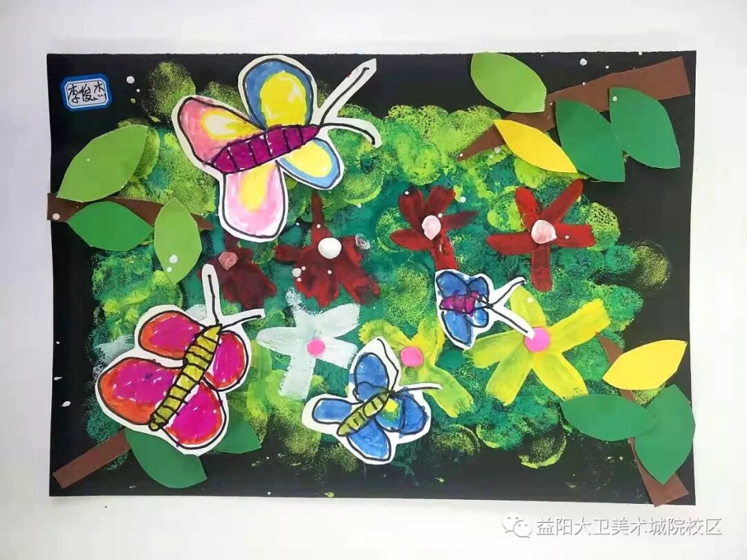 《花丛里的蝴蝶》主要学习了形状的对称和色彩的深浅变化。作品以水彩颜料和勾线笔水彩笔上色的形式完成,用海绵棒拓印出花丛的背景,画上各种颜色的小花朵,运用对称画出一只只漂亮的小蝴蝶。